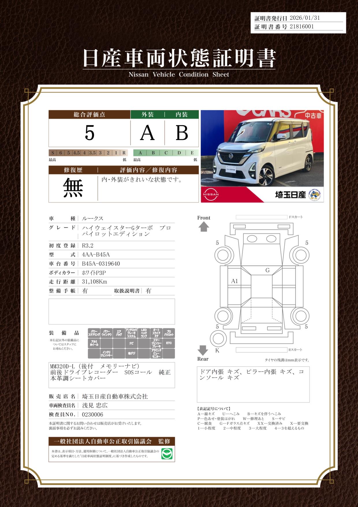 現状車検切れの状態ですが、ご成約時に新しく車検を実施します。車検費用は車両価格に含まれています。