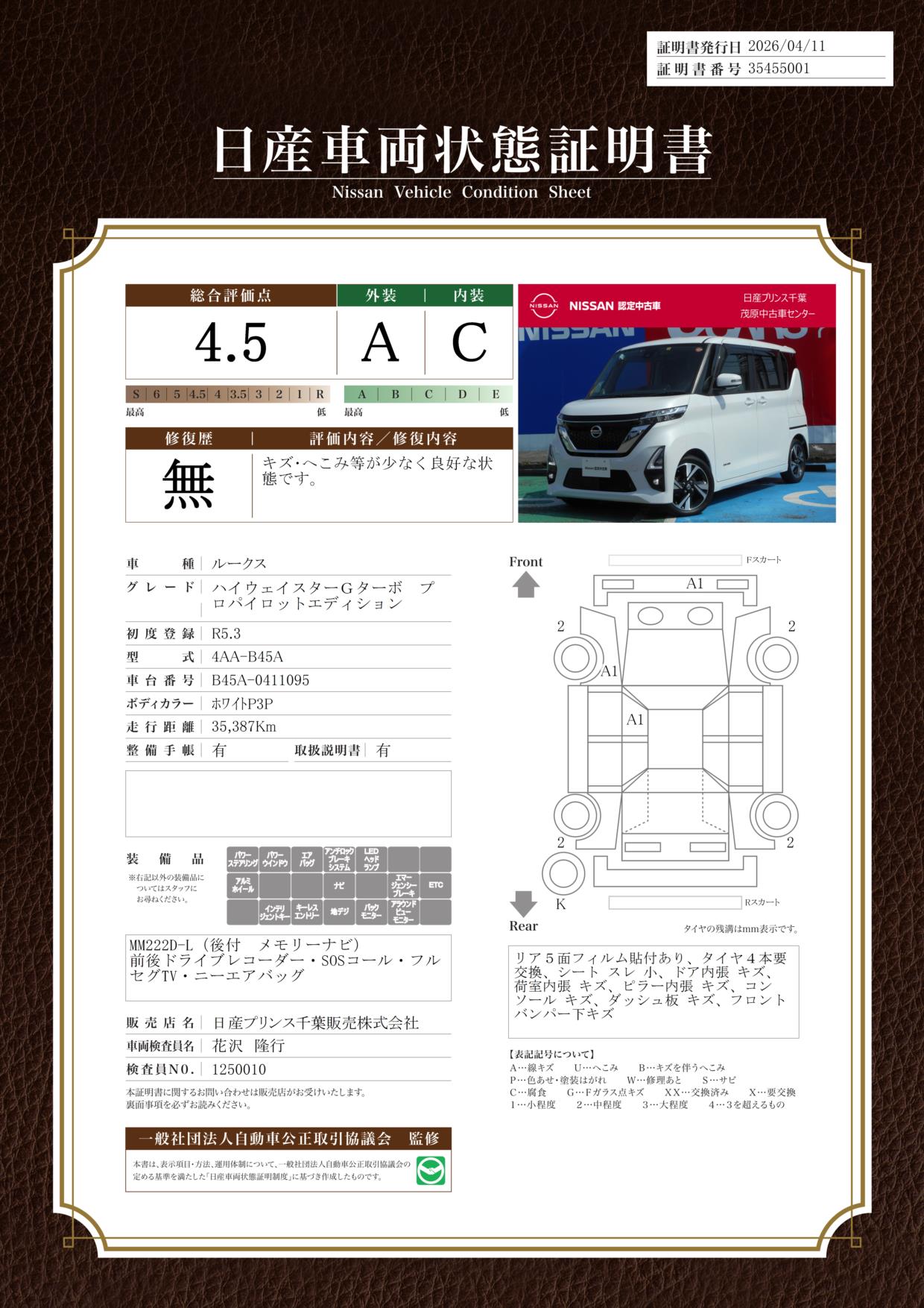 「車両状態証明書」は、査定協会監修のプロの検査員が公正かつ確かな基準で検査した”安心の証”です。
