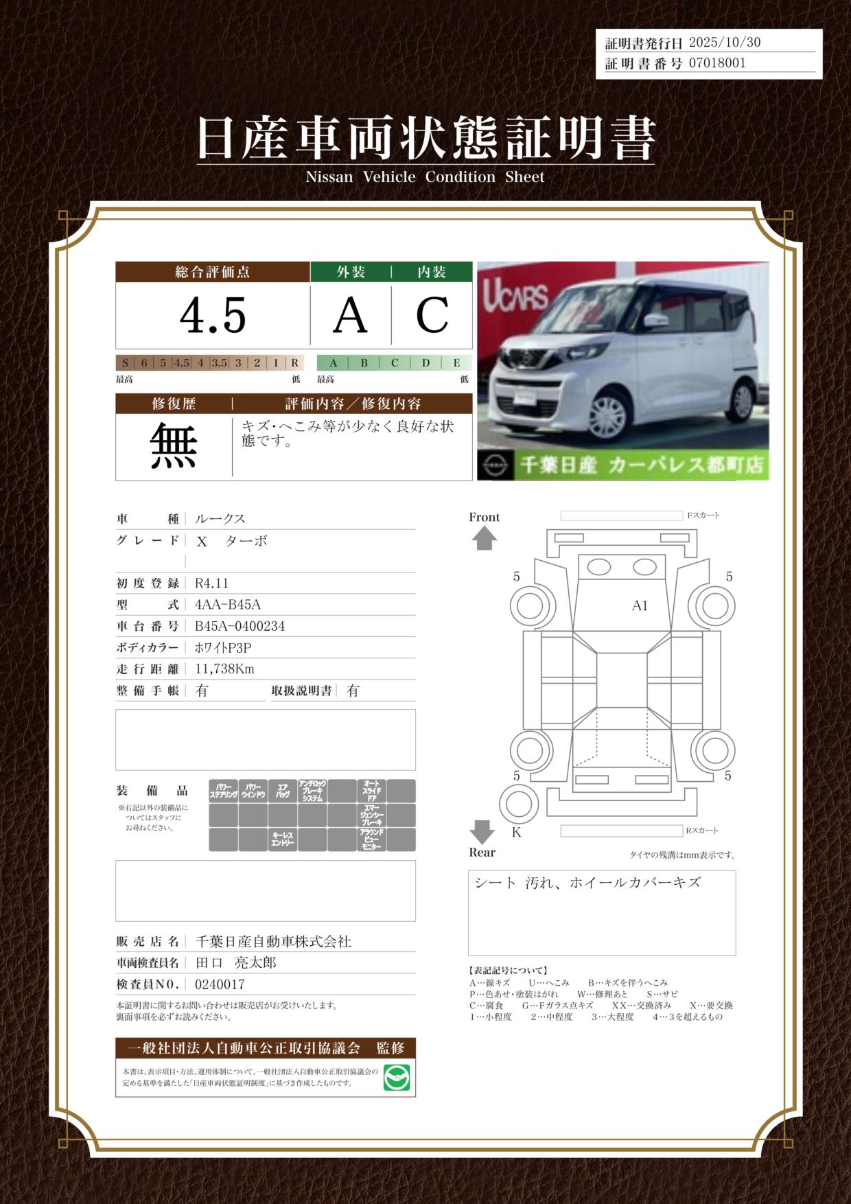 ●日産認定のクオリティショップです。日産プレミアム認定中古車、日産認定中古車、日産電動車を中心とした高品質な中古車を展示しております。 ●日産の中古車無料保証「ワイド保証」つきで安心です。他社の保証内容とぜひ見比べてください。 ●国道126号線沿いでアクセス抜群です。 ●キッズスペースもございますのでお子様連れでも安心です。 ●最寄り駅: JR千葉駅 ※公共交通機関でご来場のお客様はお声がけください。お迎えにあがります。 ●リモート商談も可能です。
