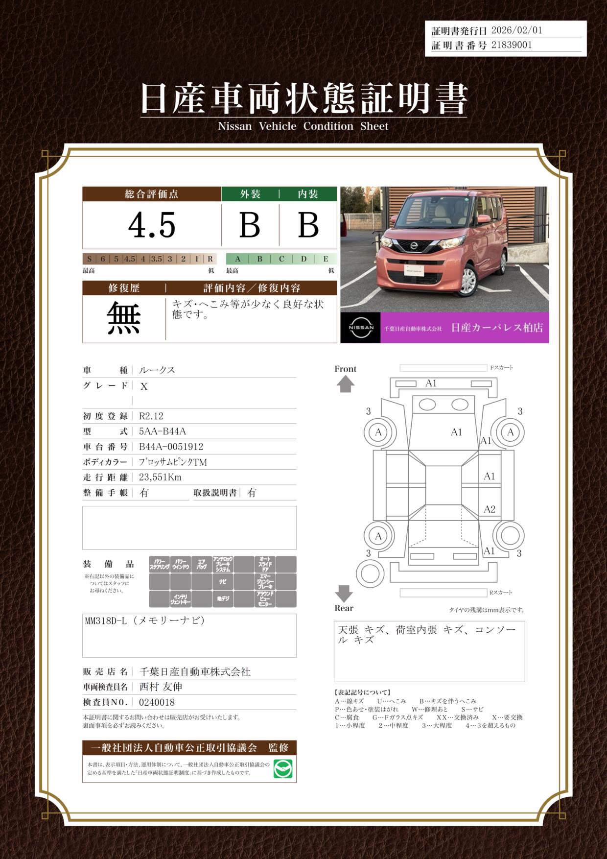 評価機関 : 日産車両状態証明