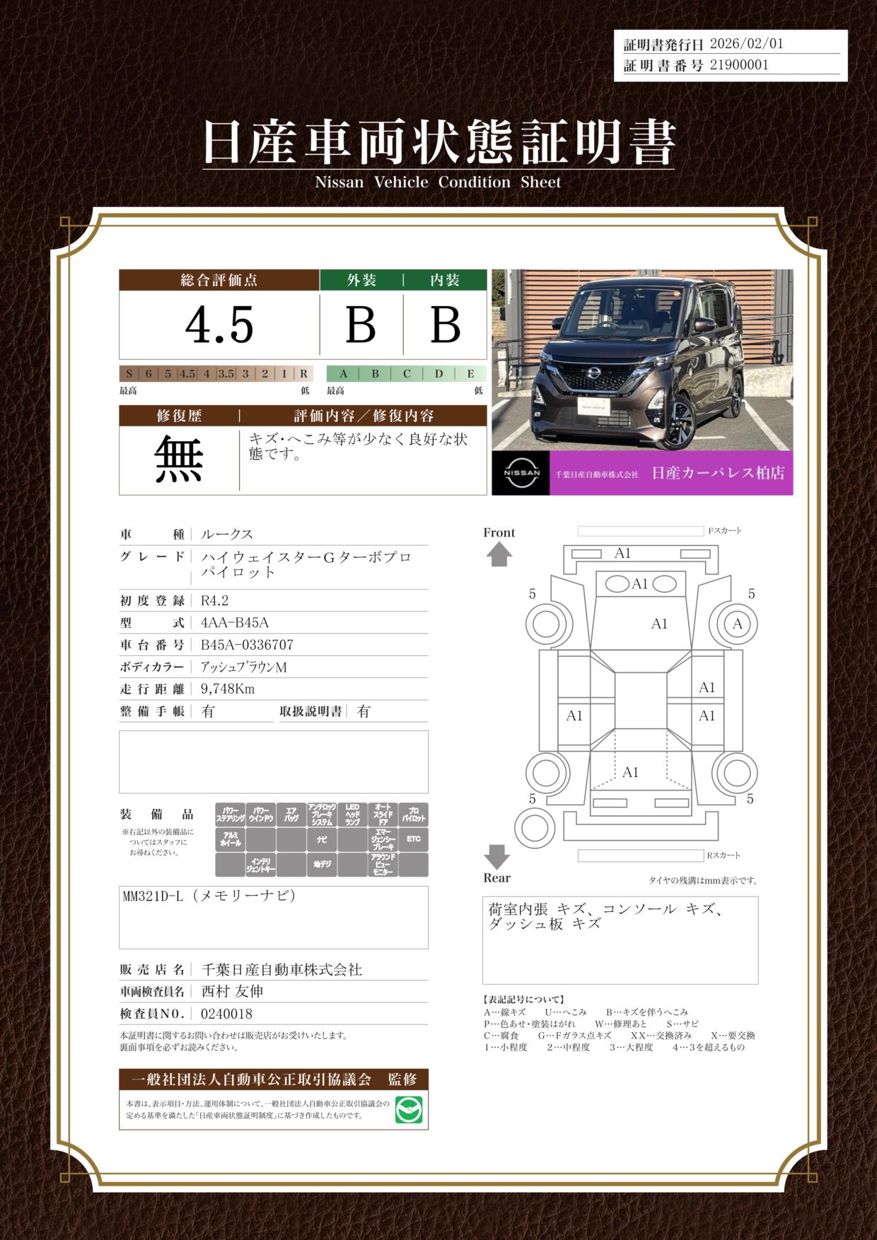 評価機関 : 日産車両状態証明