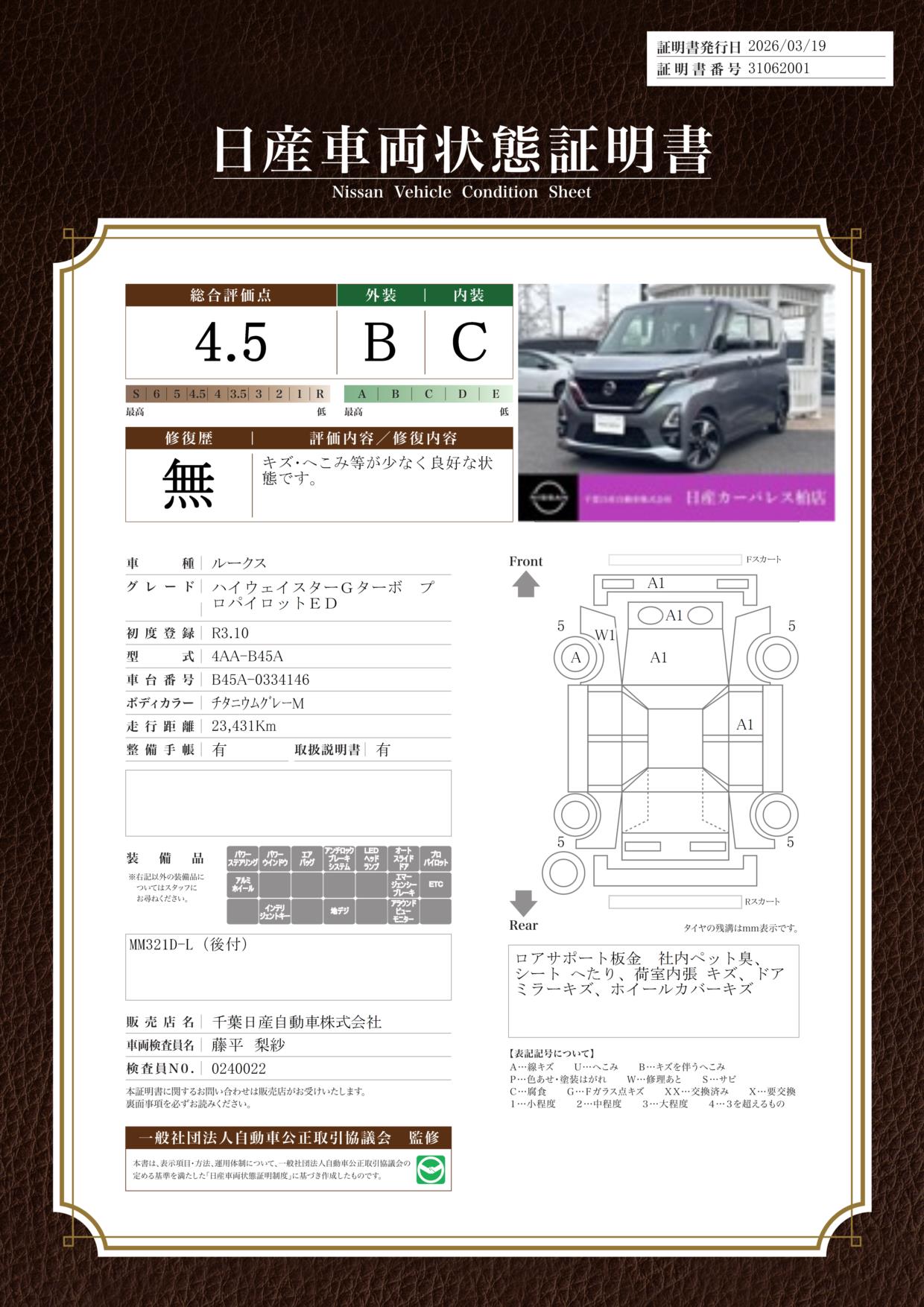 「車両状態証明書」は、査定協会監修のプロの検査員が公正かつ確かな基準で検査した”安心の証”です。