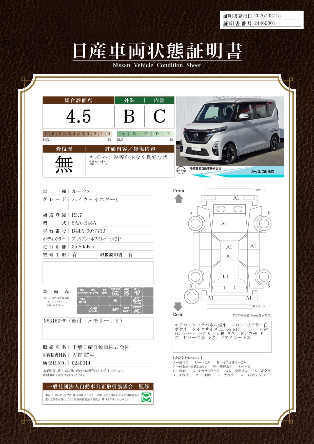 現状車検切れの状態ですが、ご成約時に新しく車検を実施します。車検費用は車両価格に含まれています。