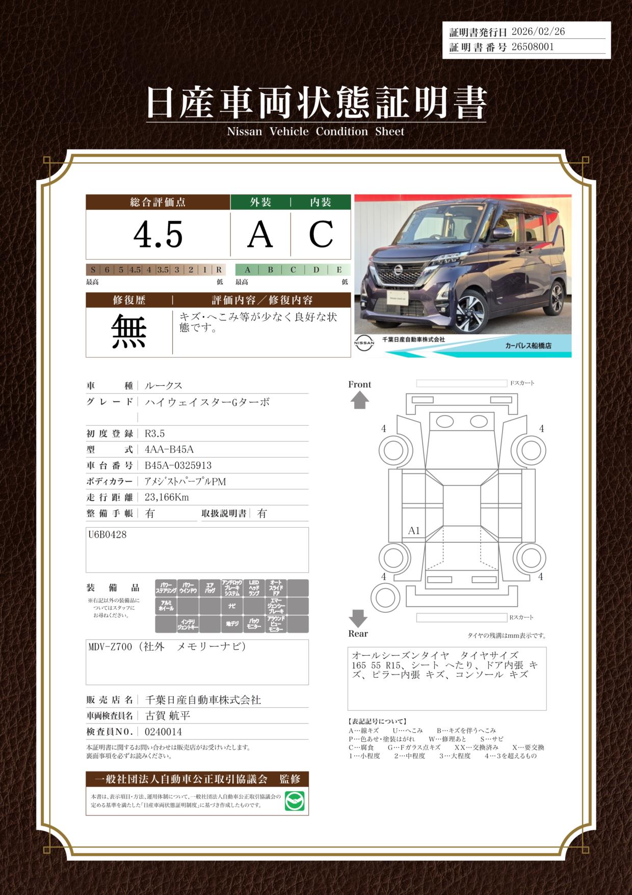 評価機関 : 日産車両状態証明