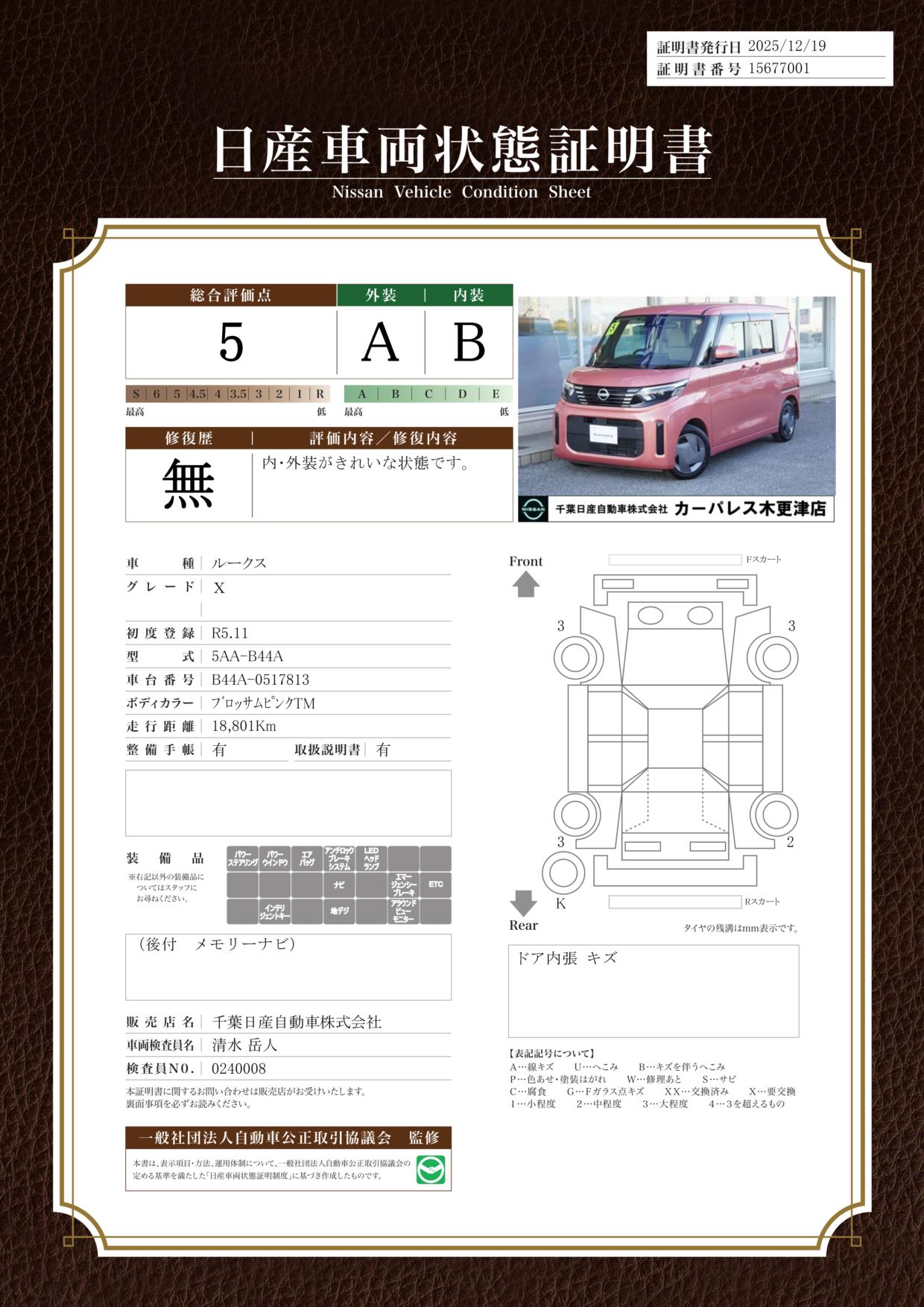 現状車検切れの状態ですが、ご成約時に新しく車検を実施します。車検費用は車両価格に含まれています。