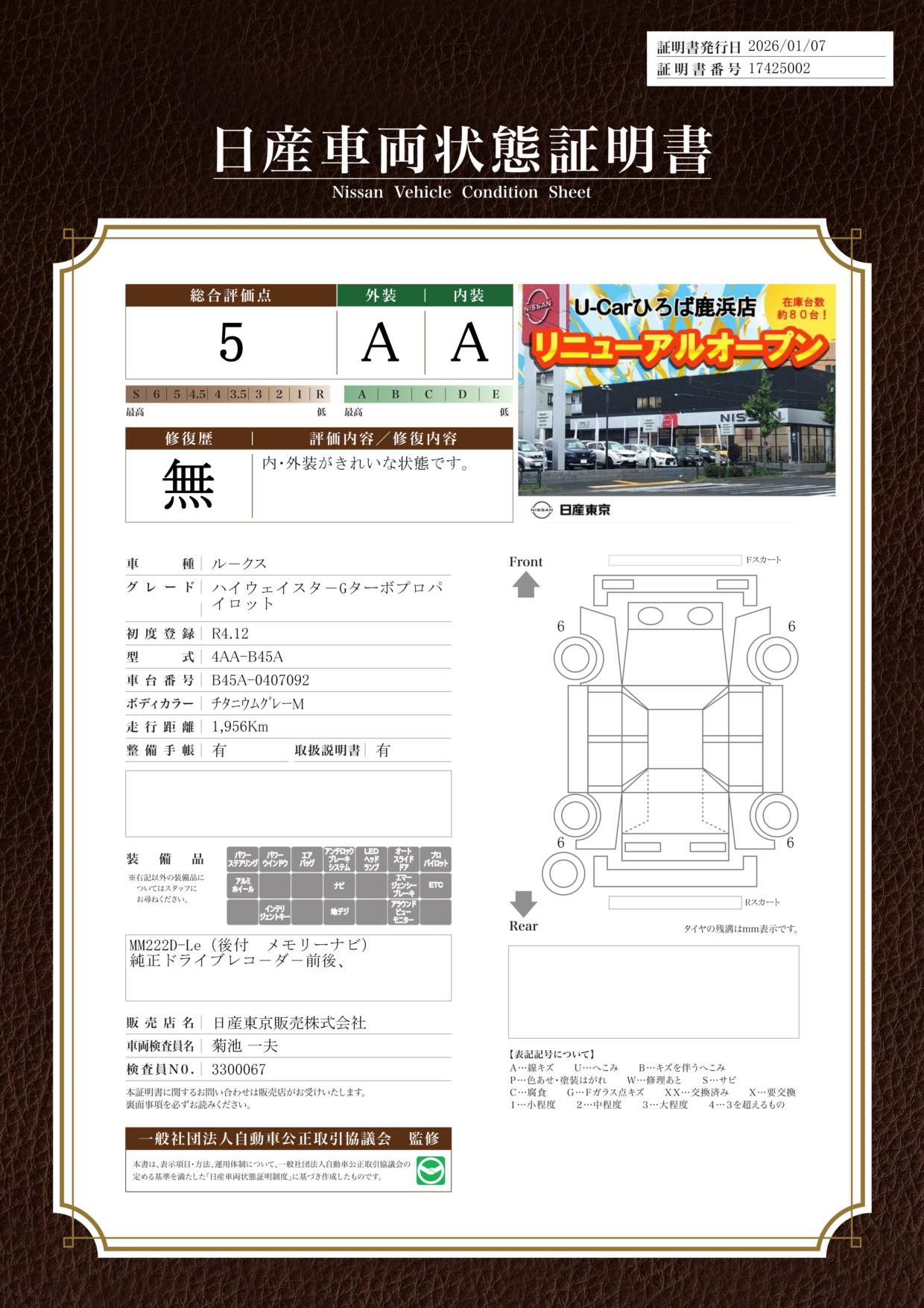 現状括弧書き内の年月まで車検有効期限が残っていますが、ご成約時に新しく車検を取り直します。なお取り直しの費用は車両価格に含まれています。