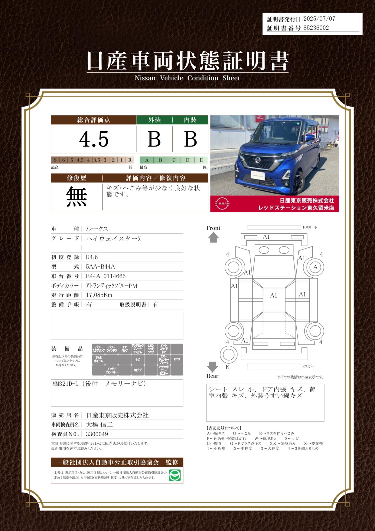 評価機関 : 日産車両状態証明