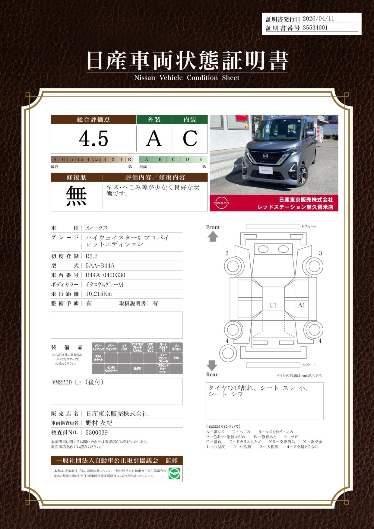「車両状態証明書」は、査定協会監修のプロの検査員が公正かつ確かな基準で検査した”安心の証”です。