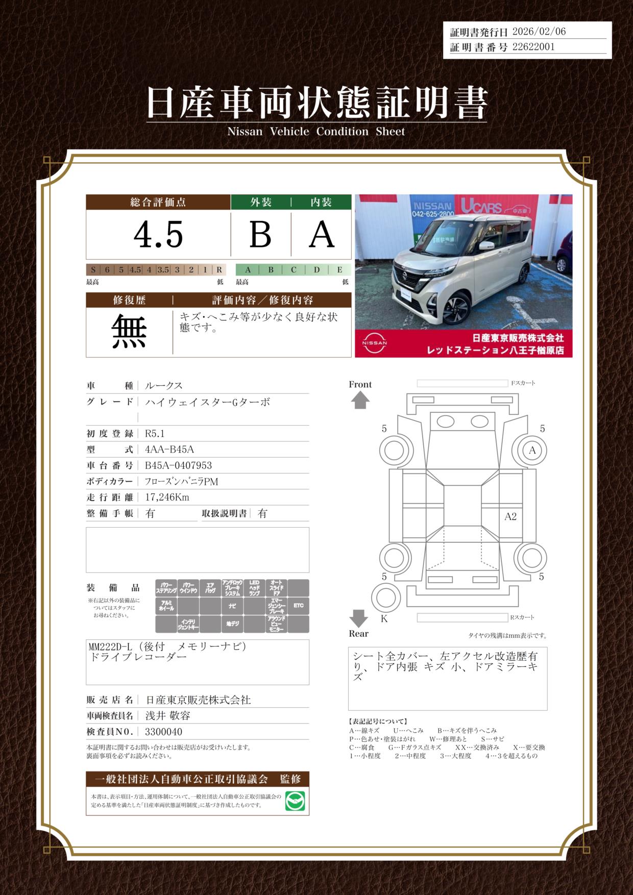 現状車検切れの状態ですが、ご成約時に新しく車検を実施します。車検費用は車両価格に含まれています。