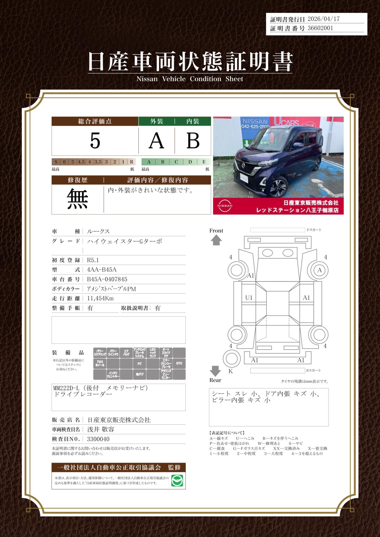 「車両状態証明書」は、査定協会監修のプロの検査員が公正かつ確かな基準で検査した”安心の証”です。