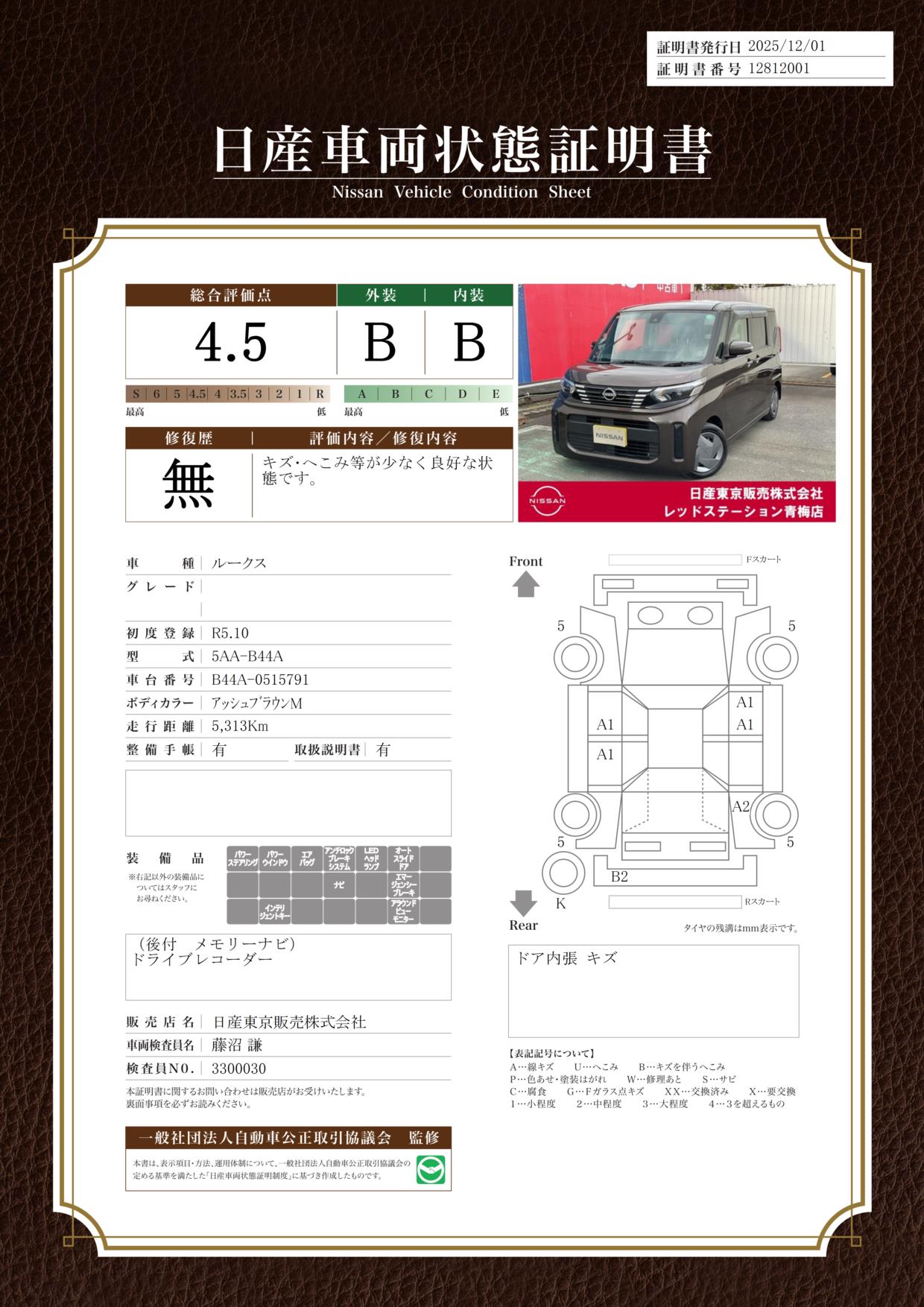 評価機関 : 日産車両状態証明