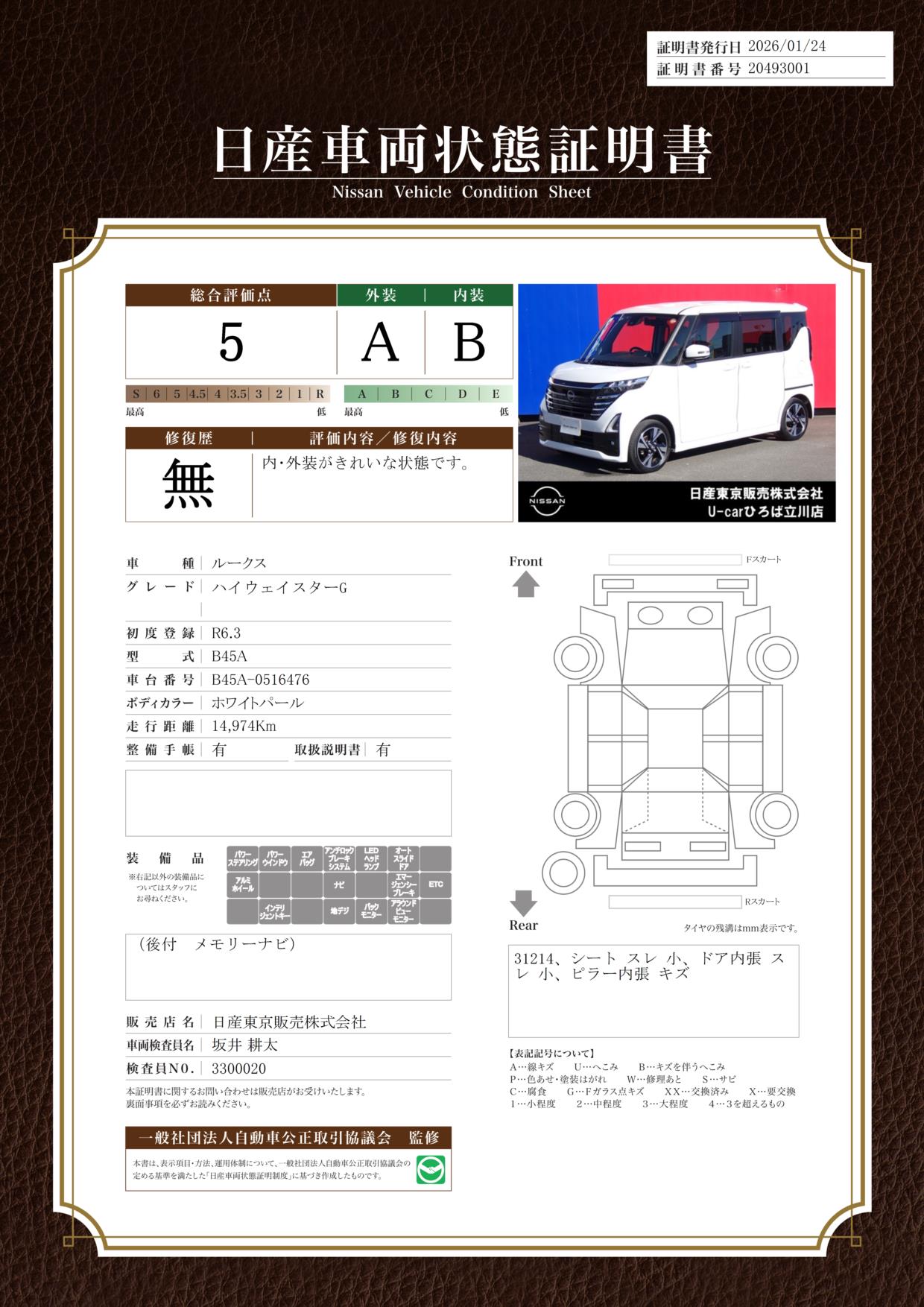 評価機関 : 日産車両状態証明