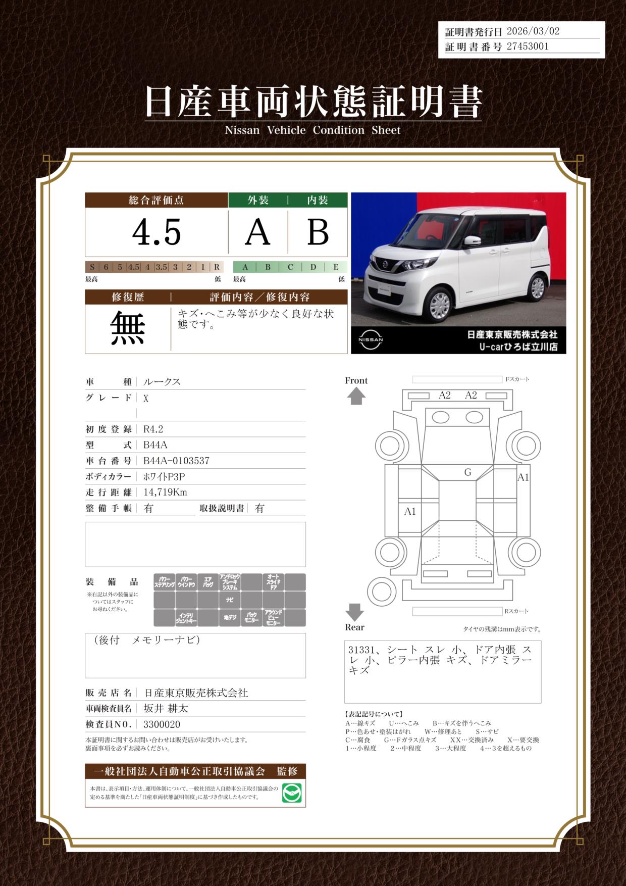 評価機関 : 日産車両状態証明