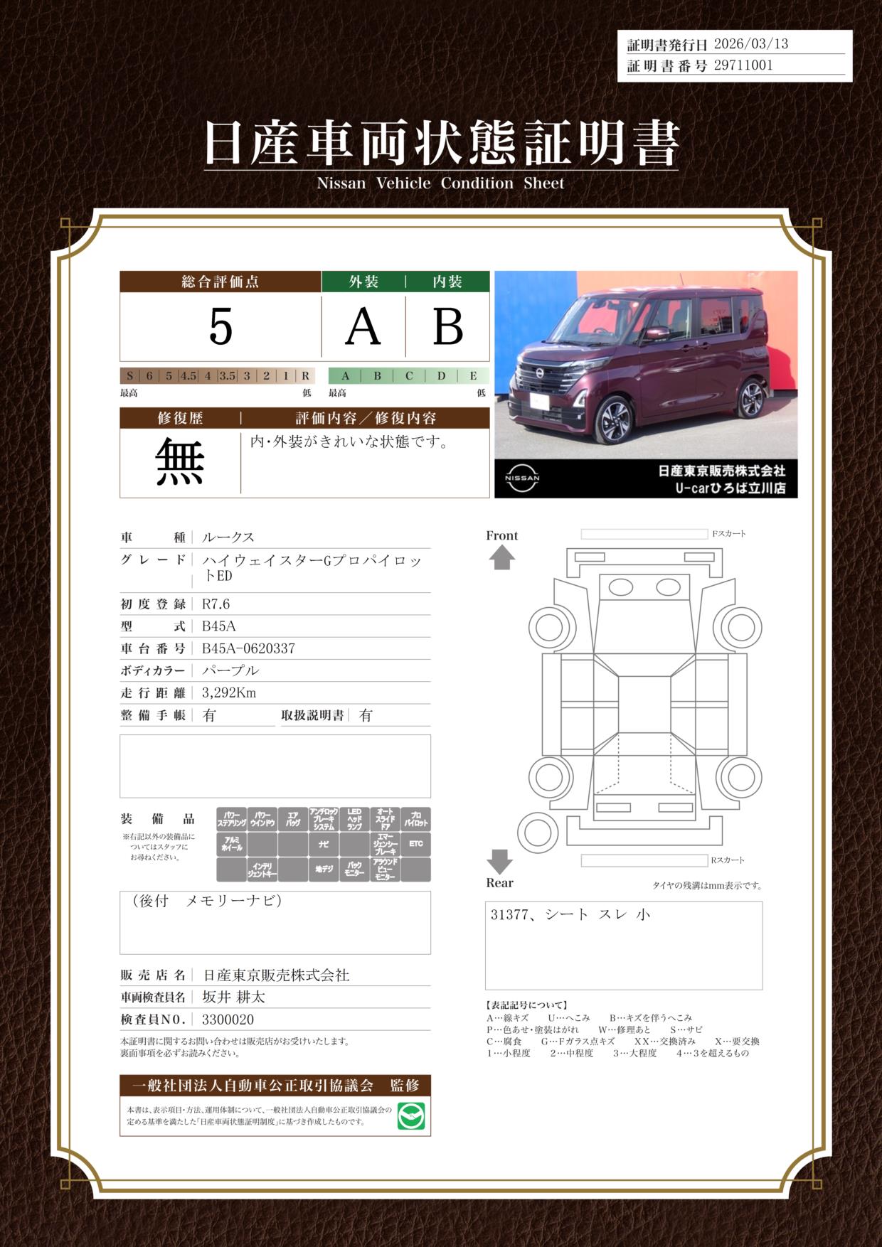 「車両状態証明書」は、査定協会監修のプロの検査員が公正かつ確かな基準で検査した”安心の証”です。