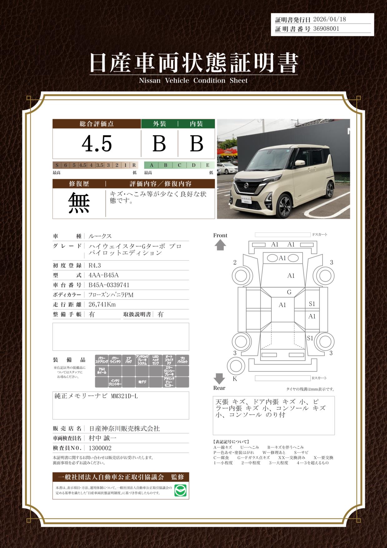 「車両状態証明書」は、査定協会監修のプロの検査員が公正かつ確かな基準で検査した”安心の証”です。