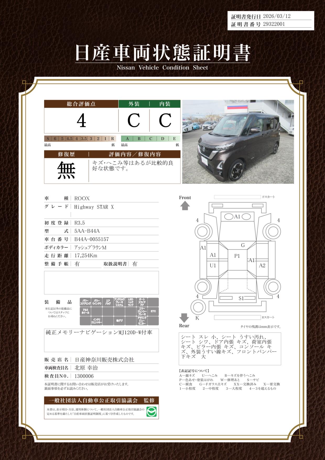 現状括弧書き内の年月まで車検有効期限が残っていますが、ご成約時に新しく車検を取り直します。なお取り直しの費用は車両価格に含まれています。