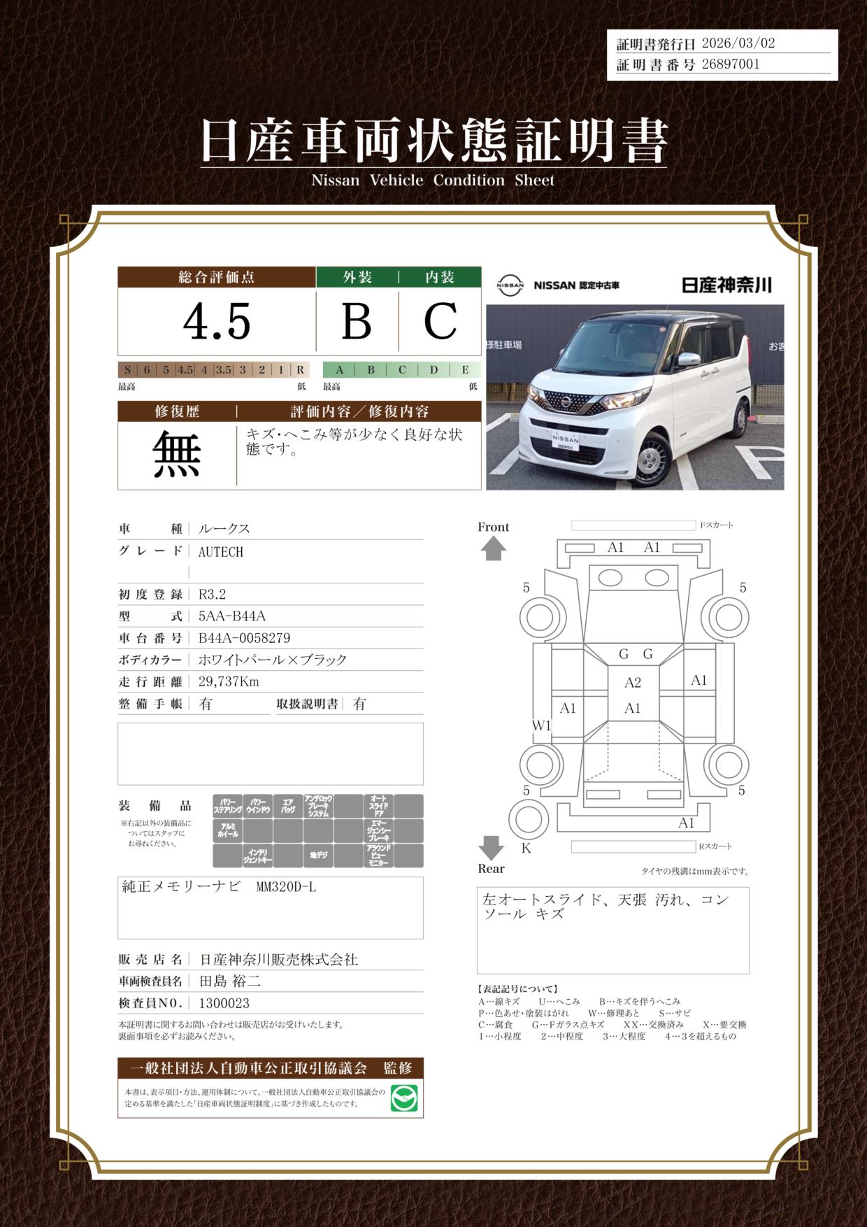 現状括弧書き内の年月まで車検有効期限が残っていますが、ご成約時に新しく車検を取り直します。なお取り直しの費用は車両価格に含まれています。