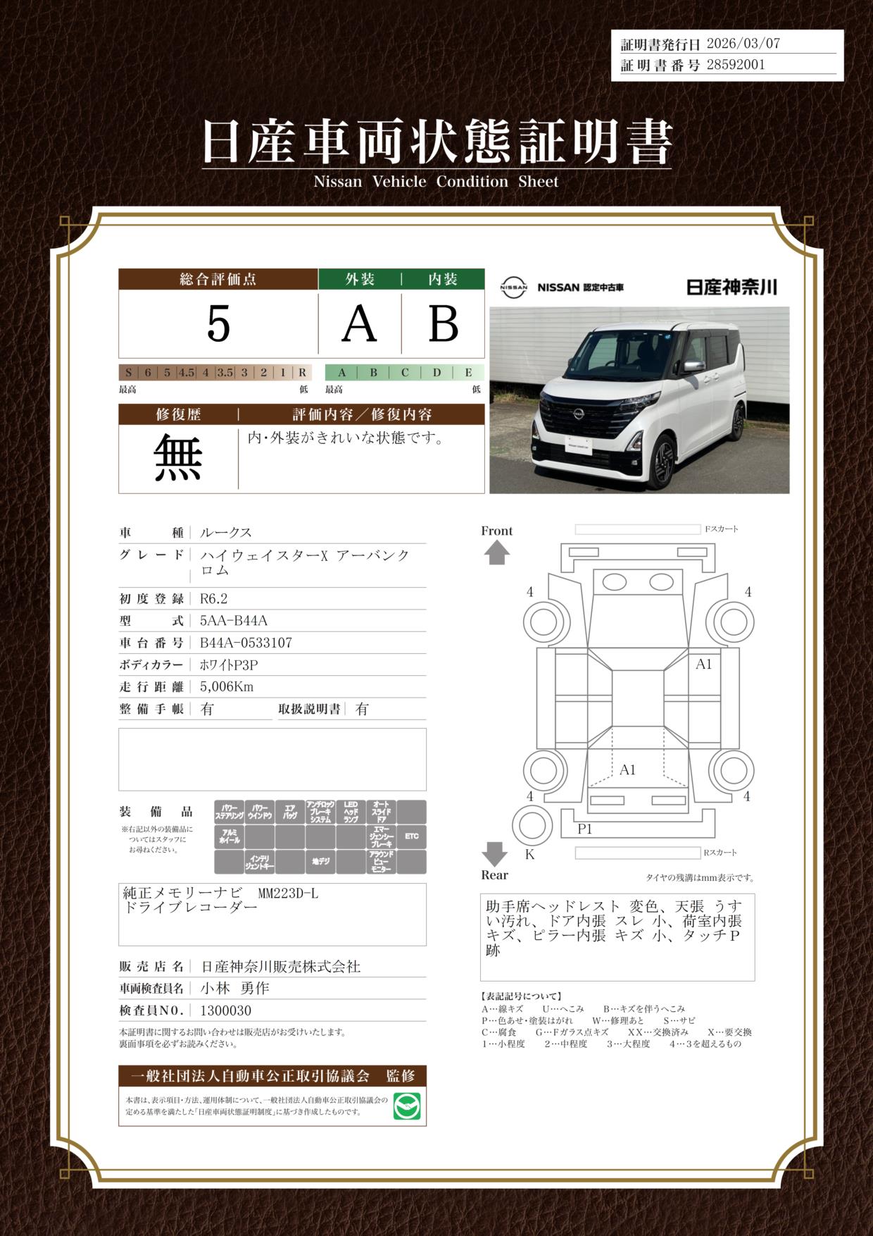 「車両状態証明書」は、査定協会監修のプロの検査員が公正かつ確かな基準で検査した”安心の証”です。