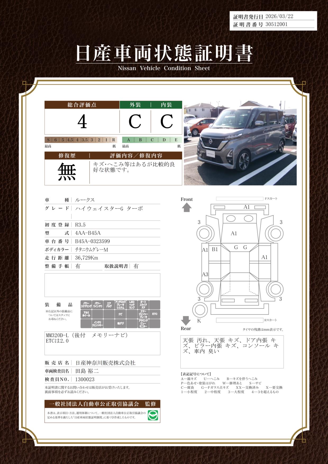 現状括弧書き内の年月まで車検有効期限が残っていますが、ご成約時に新しく車検を取り直します。なお取り直しの費用は車両価格に含まれています。