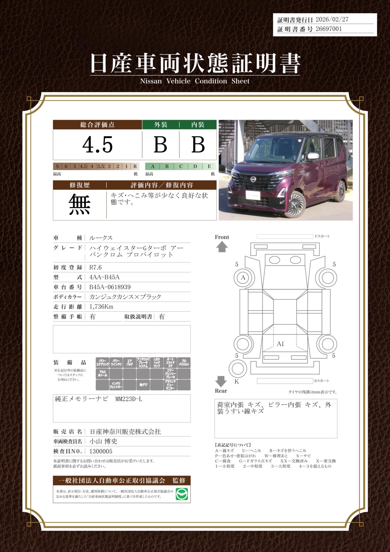 「車両状態証明書」は、査定協会監修のプロの検査員が公正かつ確かな基準で検査した”安心の証”です。
