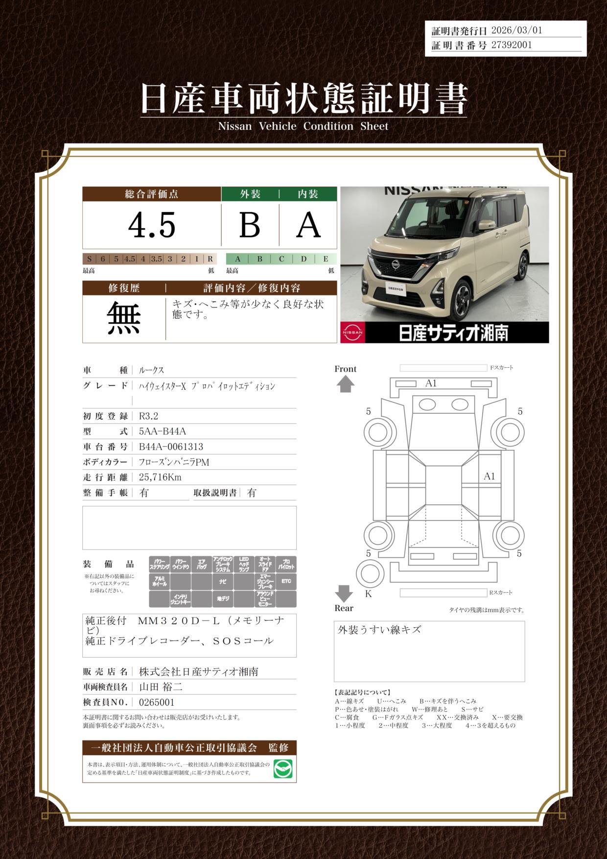 評価機関 : 日産車両状態証明