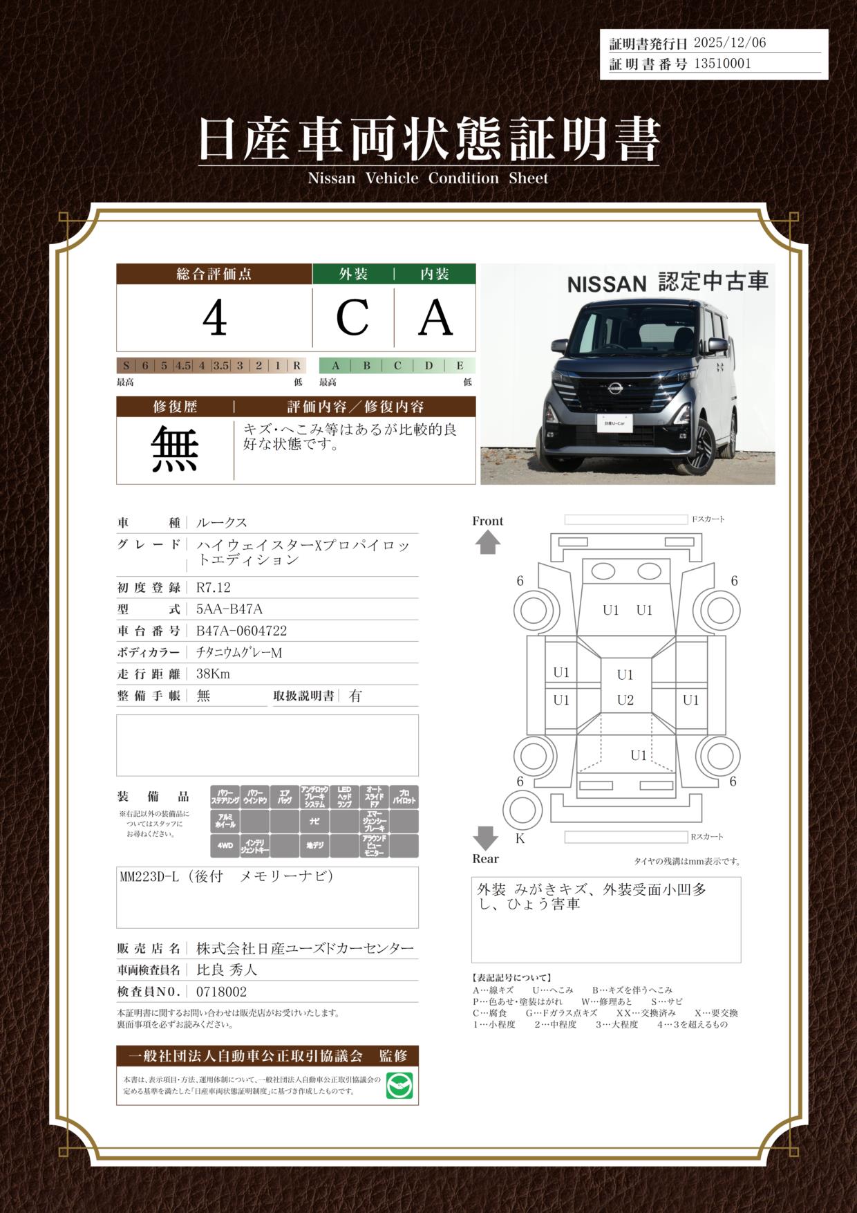 評価機関 : 日産車両状態証明