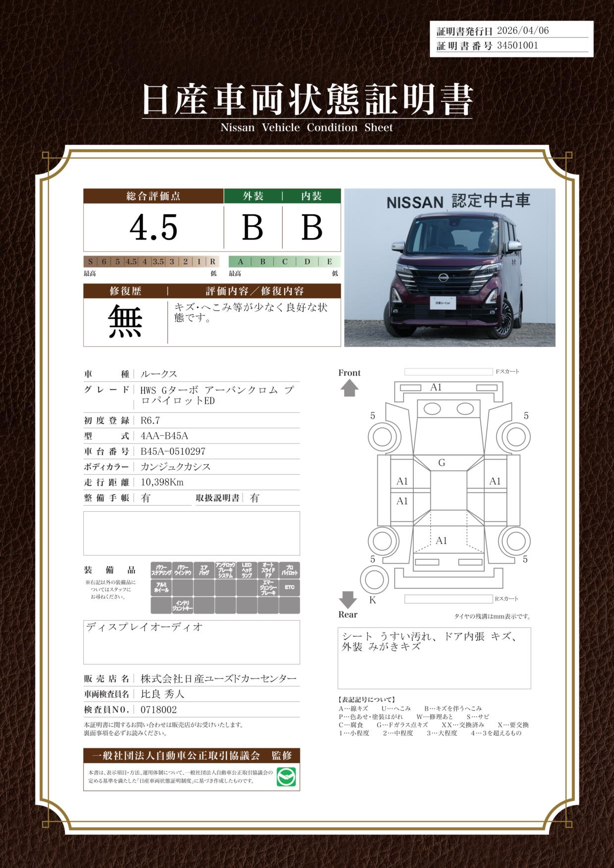 「車両状態証明書」は、査定協会監修のプロの検査員が公正かつ確かな基準で検査した”安心の証”です。