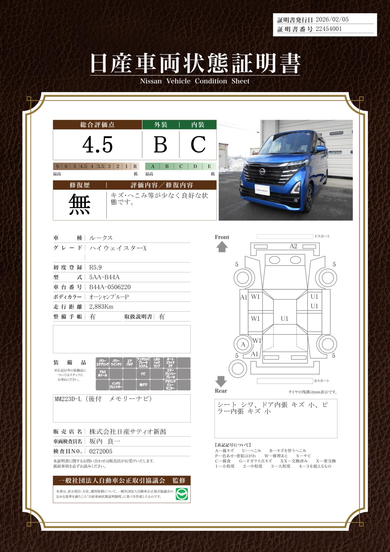 現状括弧書き内の年月まで車検有効期限が残っていますが、ご成約時に新しく車検を取り直します。なお取り直しの費用は車両価格に含まれています。