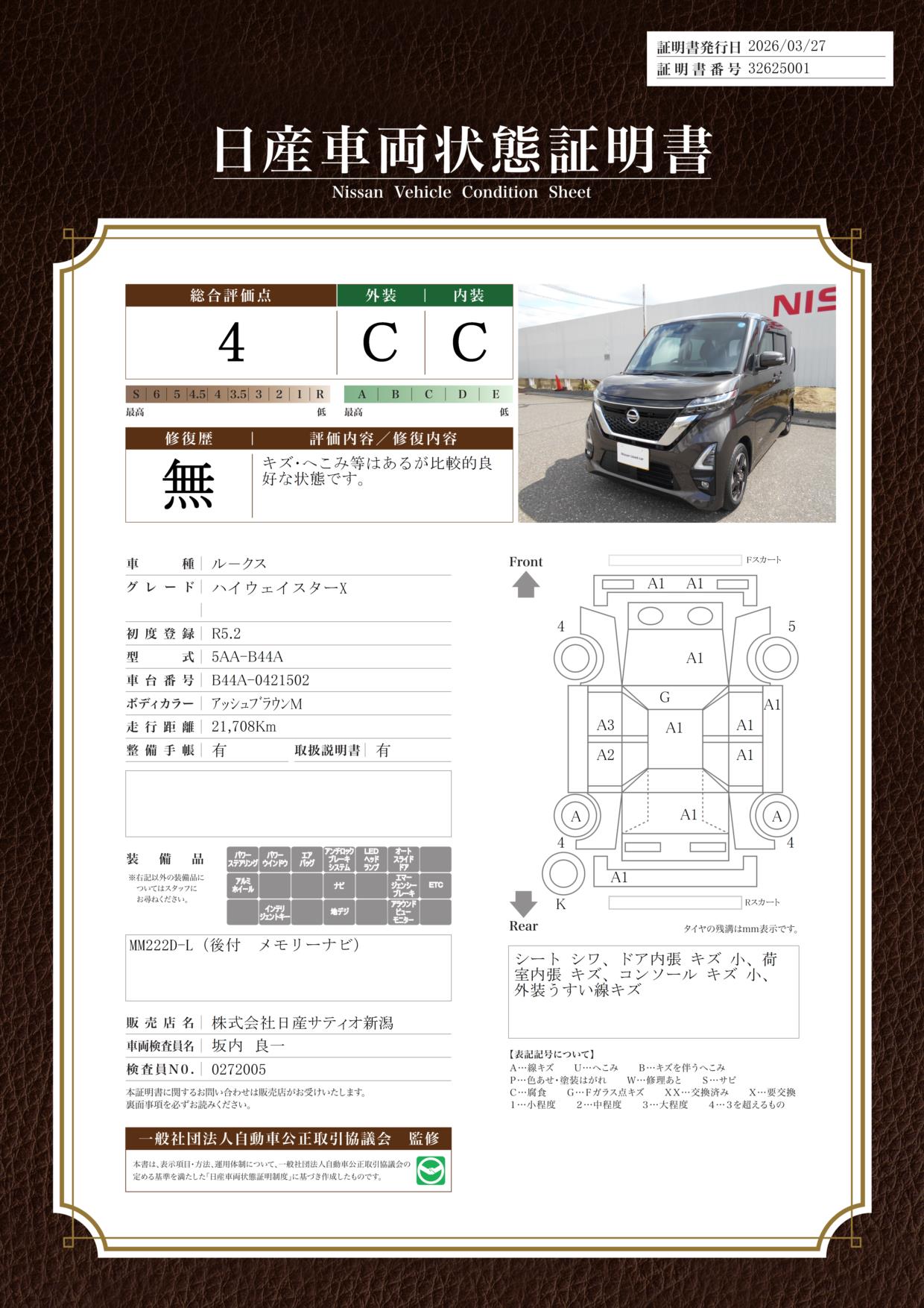 現状括弧書き内の年月まで車検有効期限が残っていますが、ご成約時に新しく車検を取り直します。なお取り直しの費用は車両価格に含まれています。