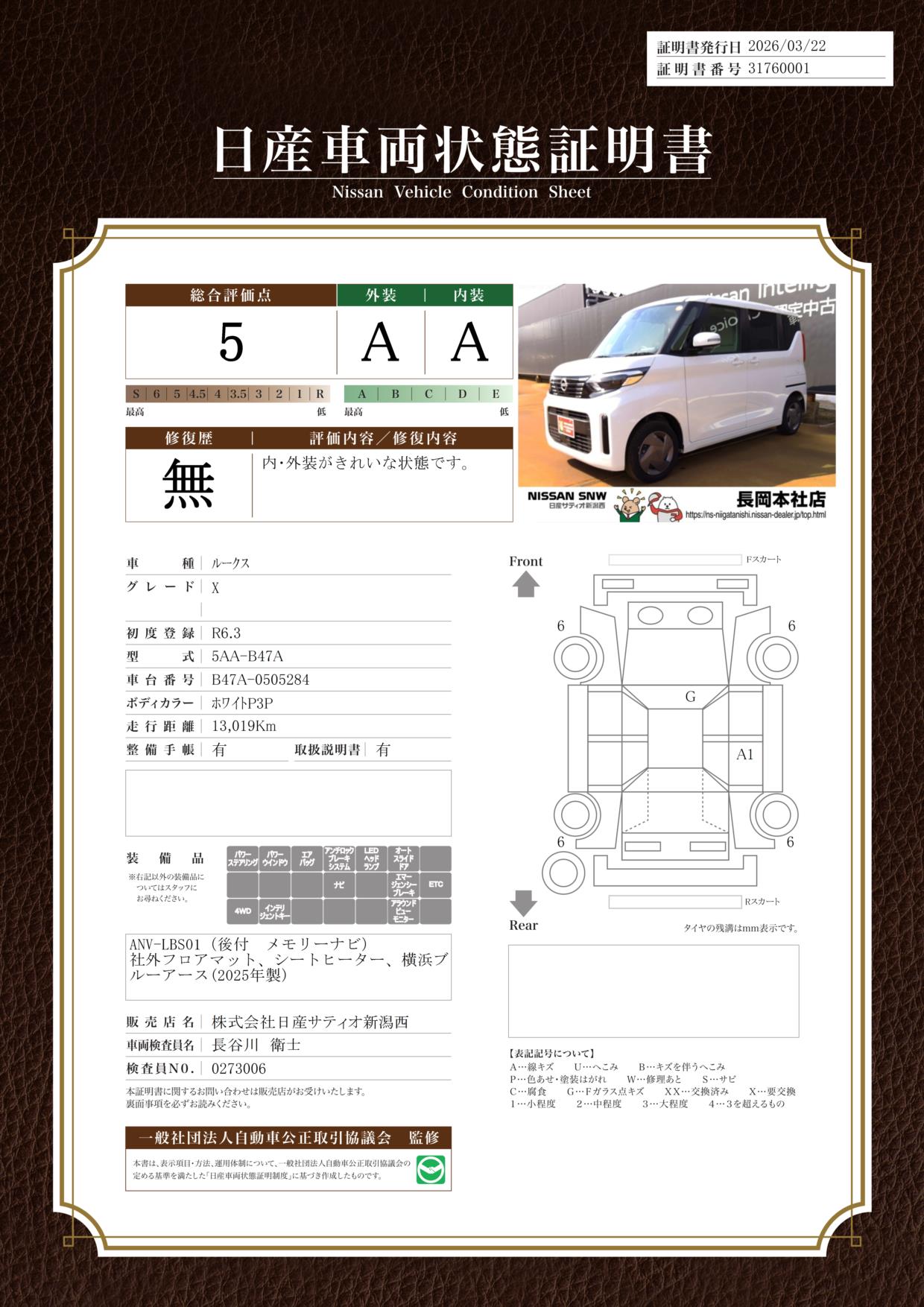「車両状態証明書」は、査定協会監修のプロの検査員が公正かつ確かな基準で検査した”安心の証”です。