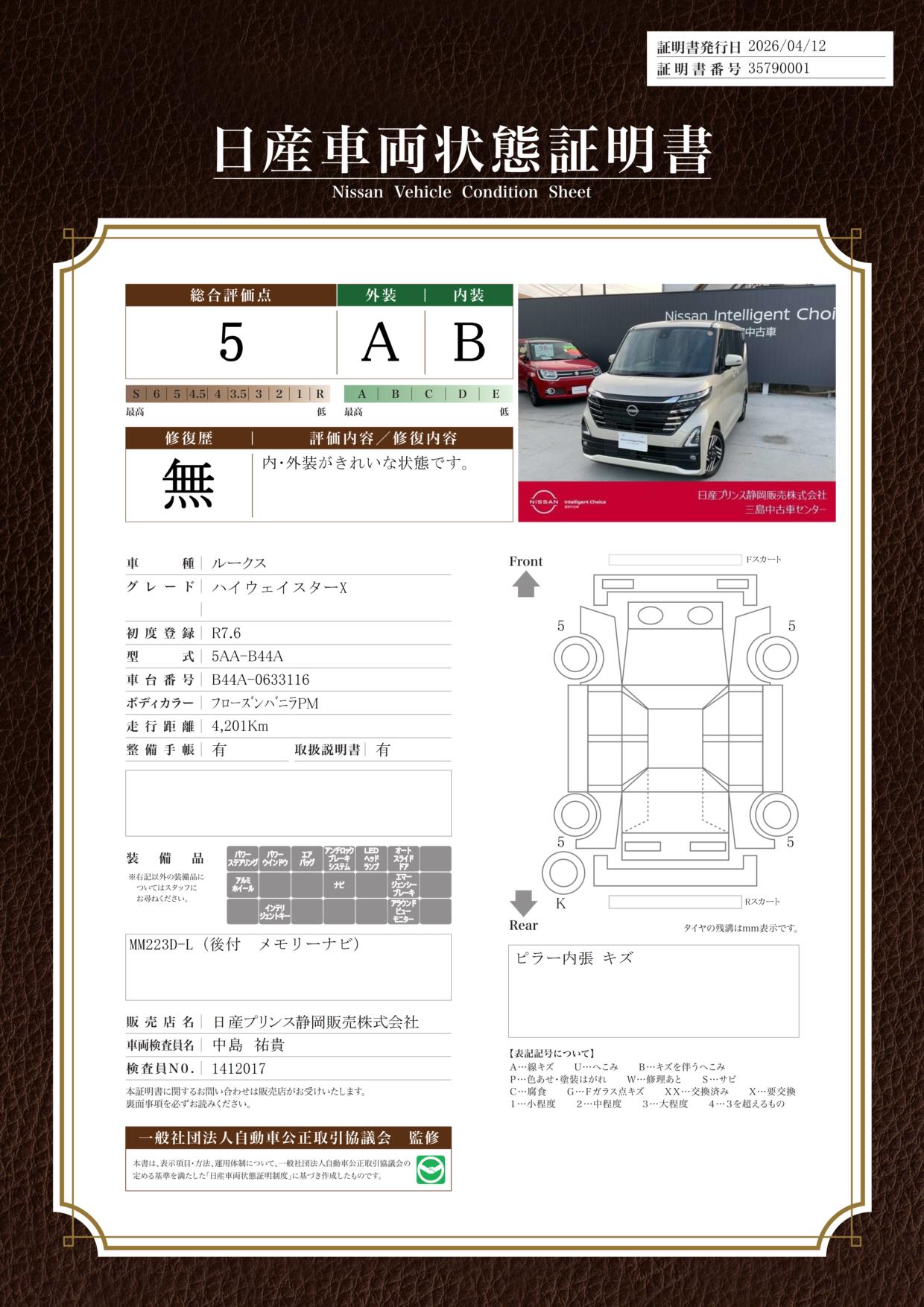 「車両状態証明書」は、査定協会監修のプロの検査員が公正かつ確かな基準で検査した”安心の証”です。