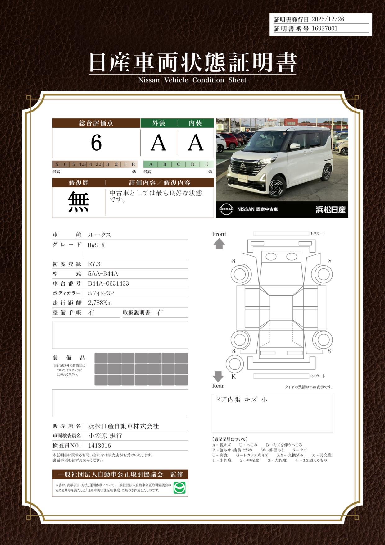 現状括弧書き内の年月まで車検有効期限が残っていますが、ご成約時に新しく車検を取り直します。なお取り直しの費用は車両価格に含まれています。