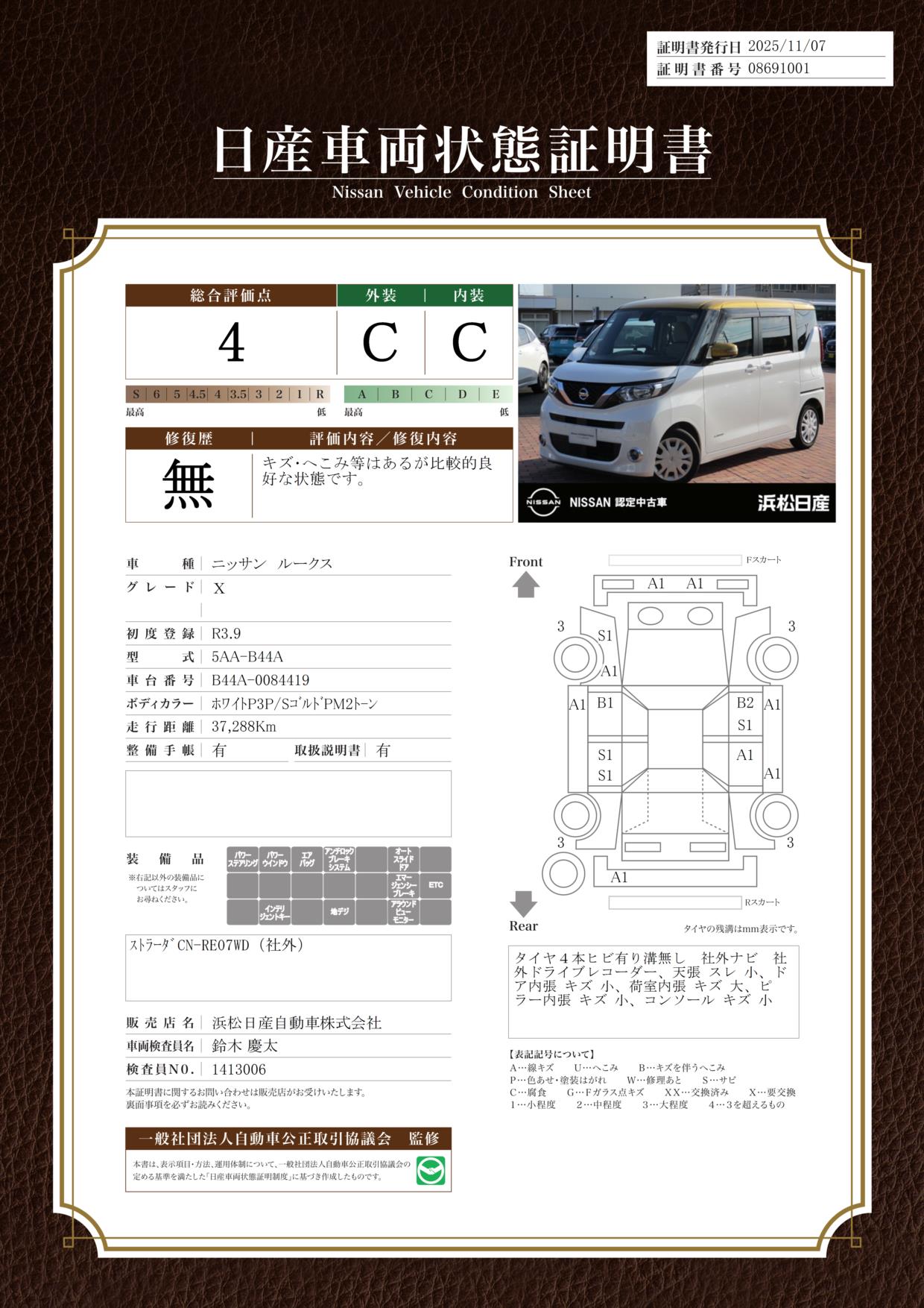現状括弧書き内の年月まで車検有効期限が残っていますが、ご成約時に新しく車検を取り直します。なお取り直しの費用は車両価格に含まれています。