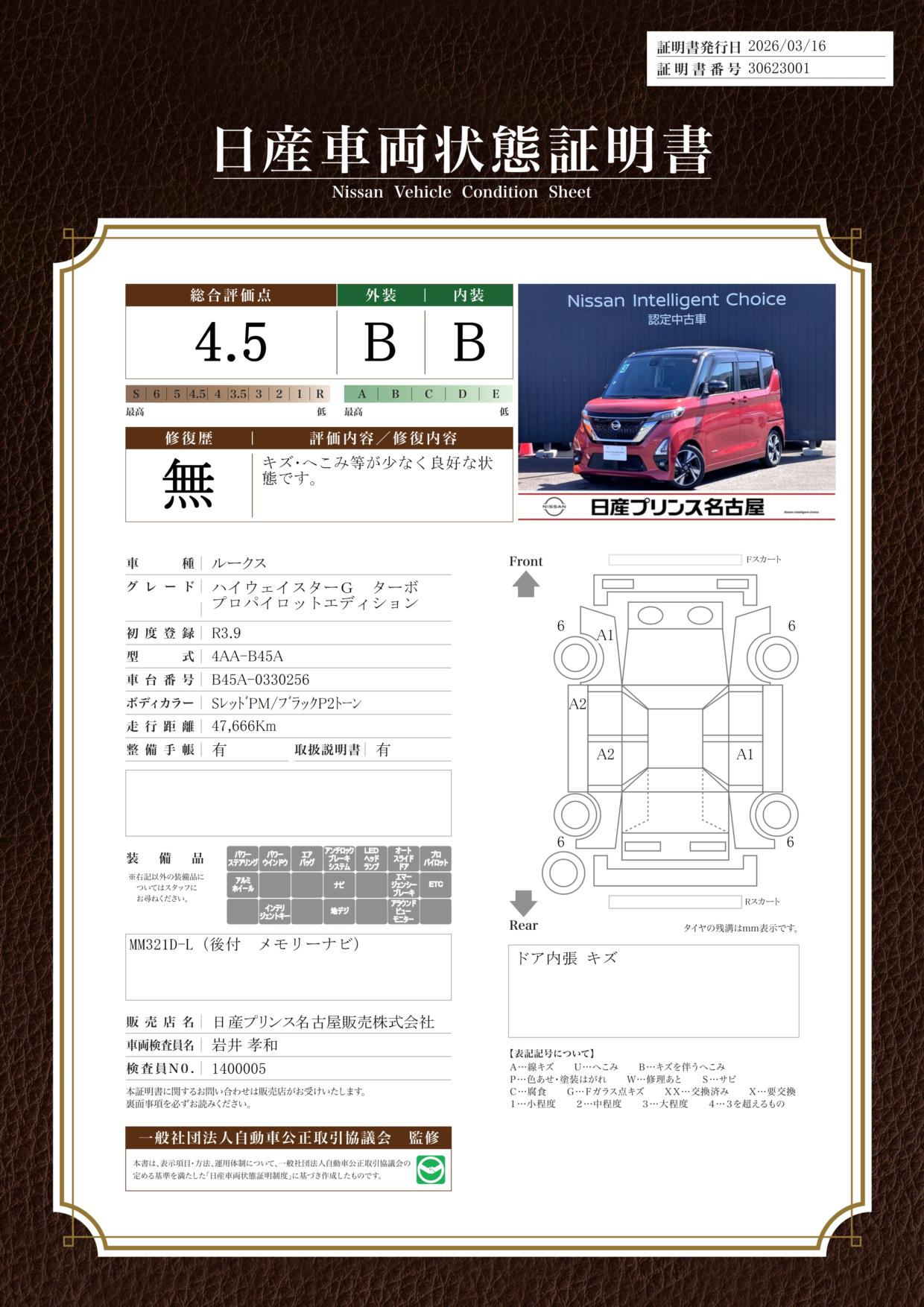 「車両状態証明書」は、査定協会監修のプロの検査員が公正かつ確かな基準で検査した”安心の証”です。