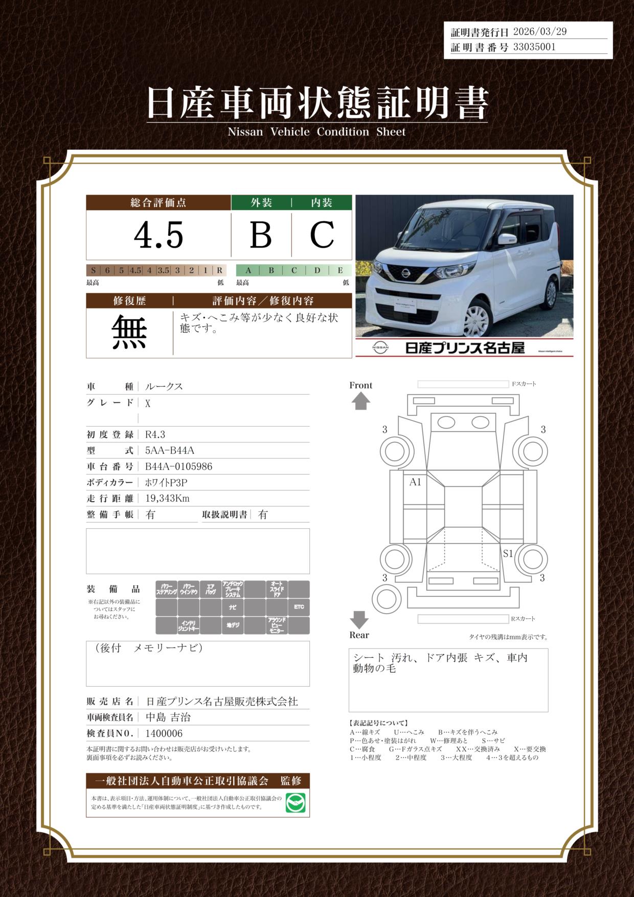 「車両状態証明書」は、査定協会監修のプロの検査員が公正かつ確かな基準で検査した”安心の証”です。