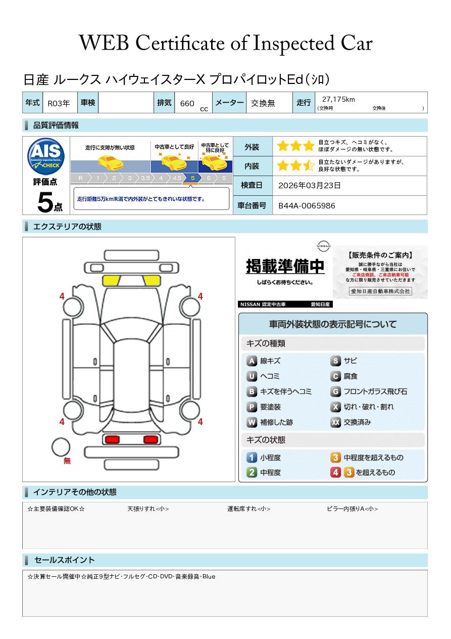 現状括弧書き内の年月まで車検有効期限が残っていますが、ご成約時に新しく車検を取り直します。なお取り直しの費用は車両価格に含まれています。