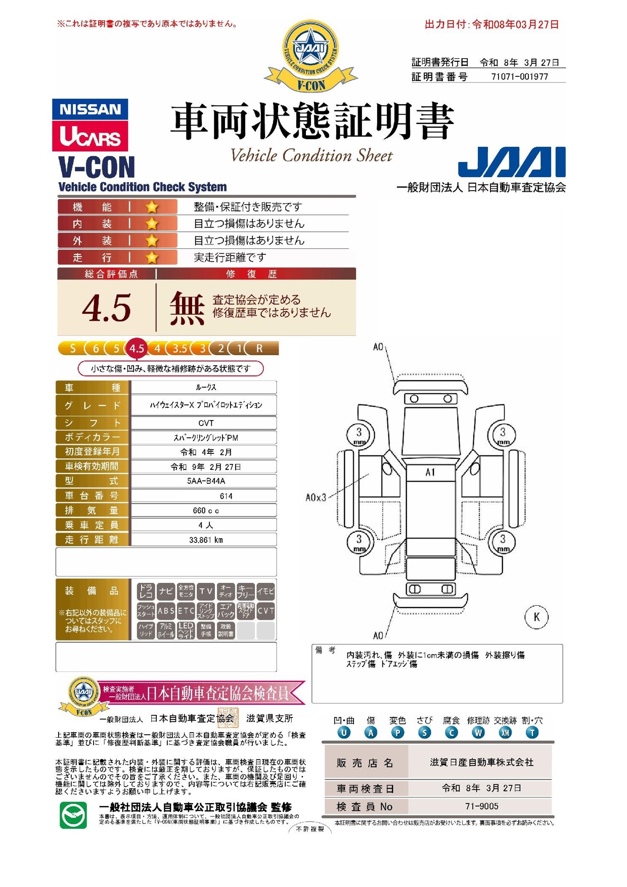 「車両状態証明書」は、査定協会監修のプロの検査員が公正かつ確かな基準で検査した”安心の証”です。