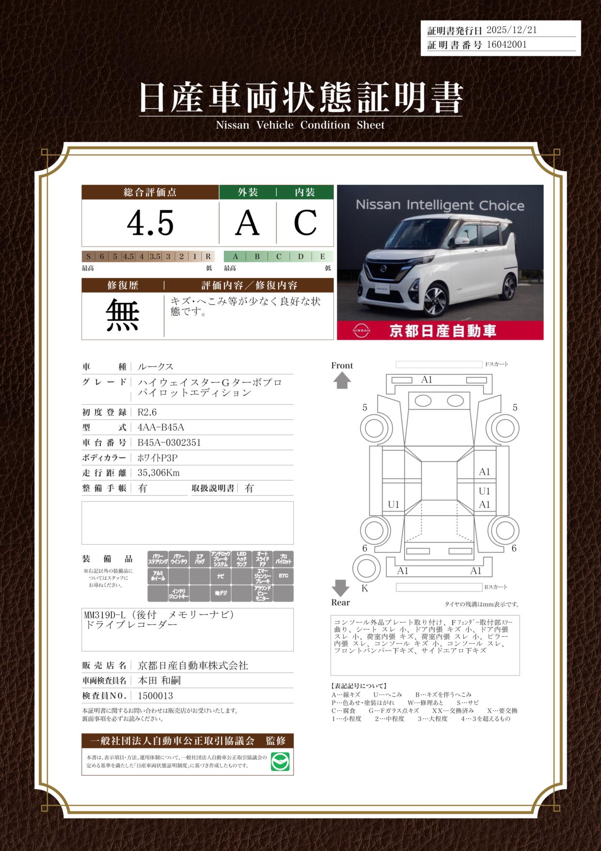 京都日産自動車『日産カーパレス伏見店』です!! 当店では1度ご来店頂いて実際にお車をご確認頂いていただける方に販売させていただいております、ご了承下さい。 ご来店の際は事前に在庫・商談状況の確認をお願いします。 ●日産ディーラーで買うおススメポイント! 日産の販売店の中古車には全社無料で「ワイド保証」が付いております。(一部加入が出来ない車両もございます。)