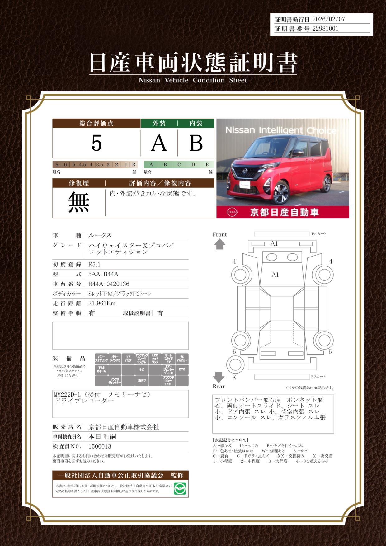 「車両状態証明書」は、査定協会監修のプロの検査員が公正かつ確かな基準で検査した”安心の証”です。