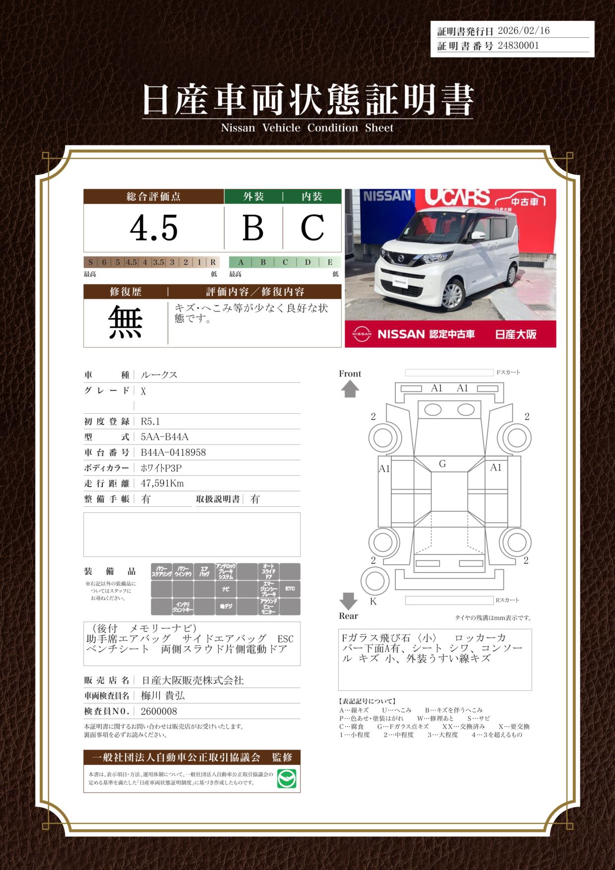「車両状態証明書」は、査定協会監修のプロの検査員が公正かつ確かな基準で検査した”安心の証”です。