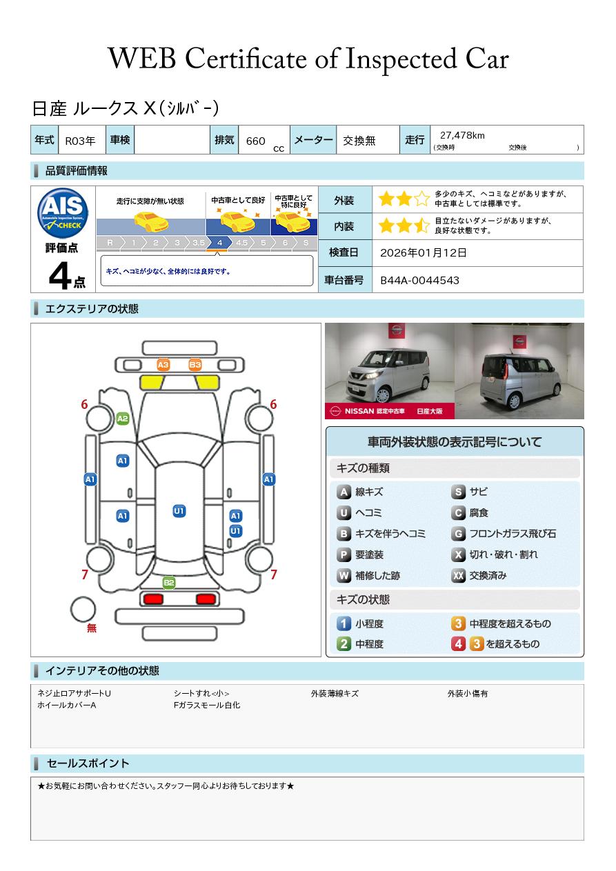 現状括弧書き内の年月まで車検有効期限が残っていますが、ご成約時に新しく車検を取り直します。なお取り直しの費用は車両価格に含まれています。