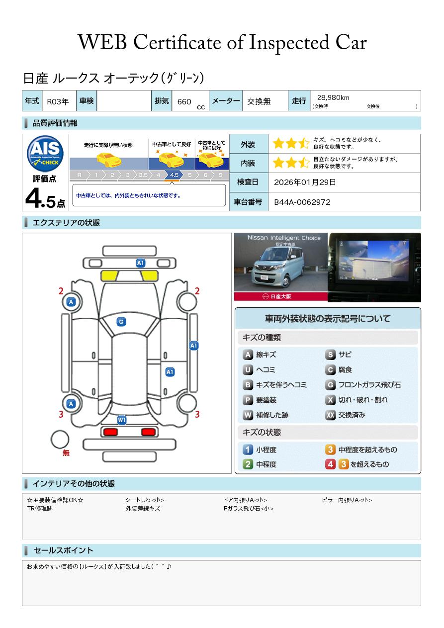 評価点イメージ : 中古車としては、内外装ともきれいな状態です。