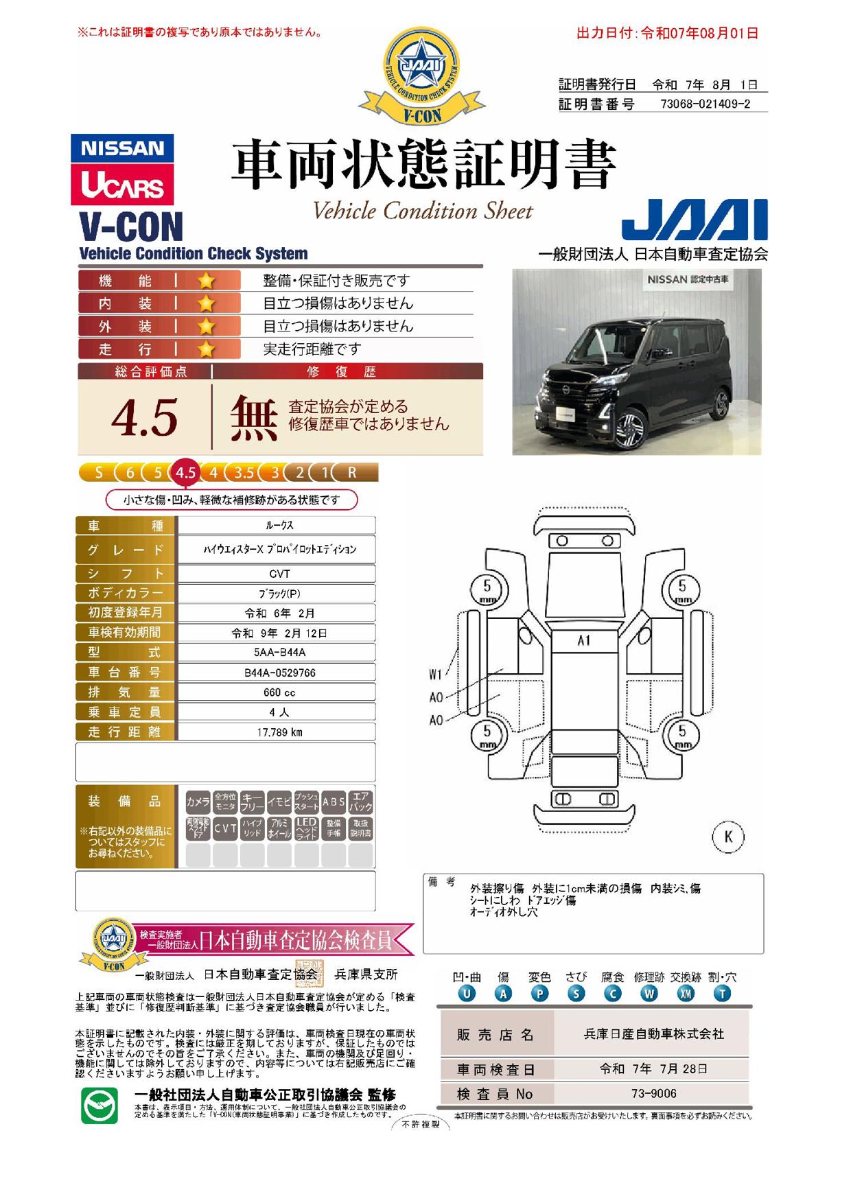 「車両状態証明書」は、査定協会監修のプロの検査員が公正かつ確かな基準で検査した”安心の証”です。