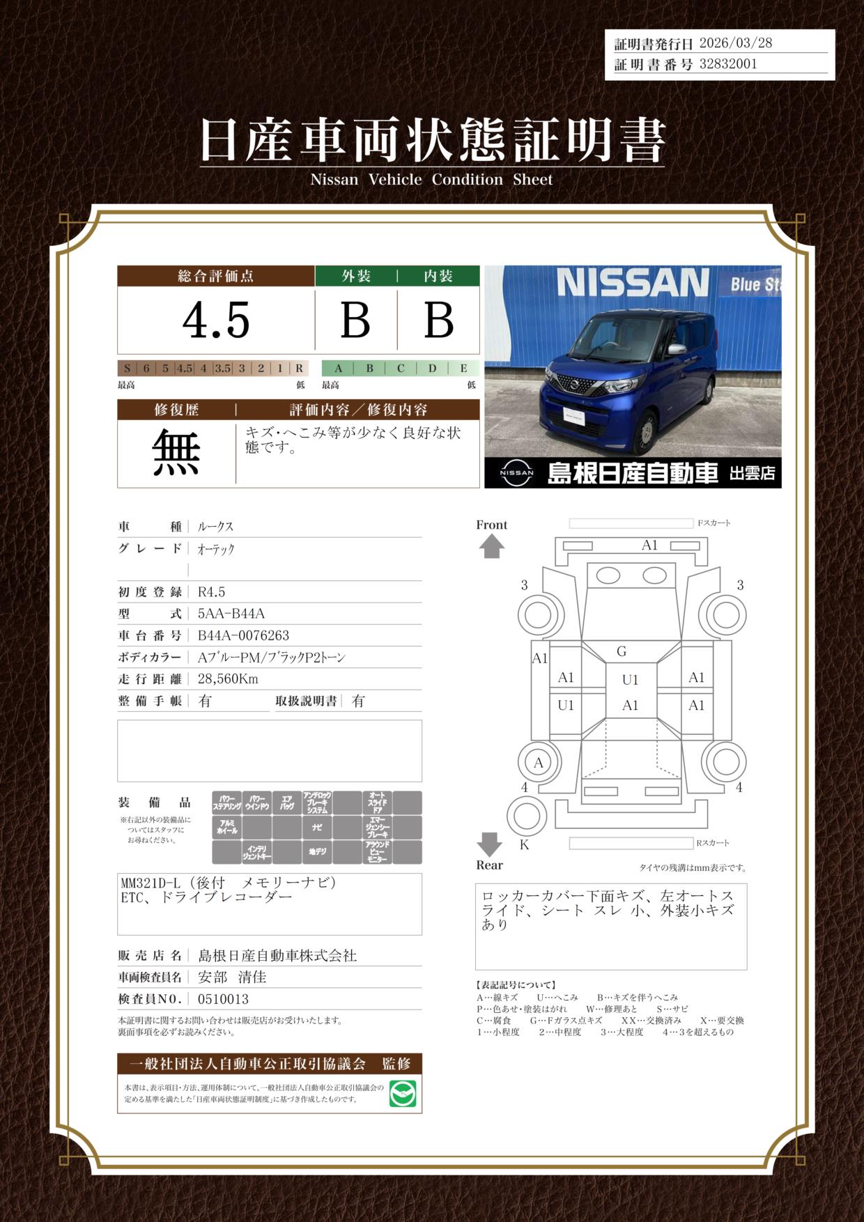「車両状態証明書」は、査定協会監修のプロの検査員が公正かつ確かな基準で検査した”安心の証”です。