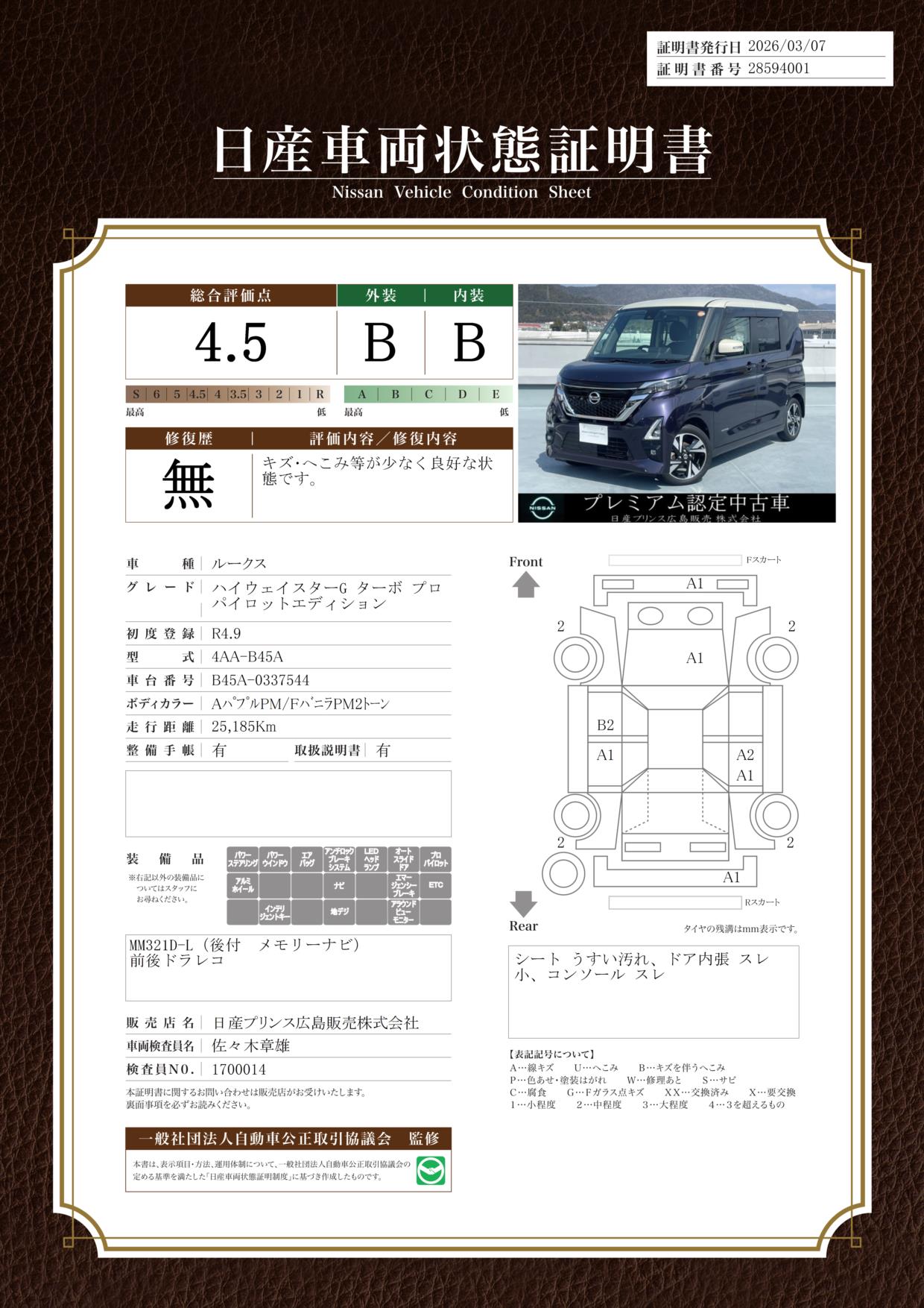 「車両状態証明書」は、査定協会監修のプロの検査員が公正かつ確かな基準で検査した”安心の証”です。