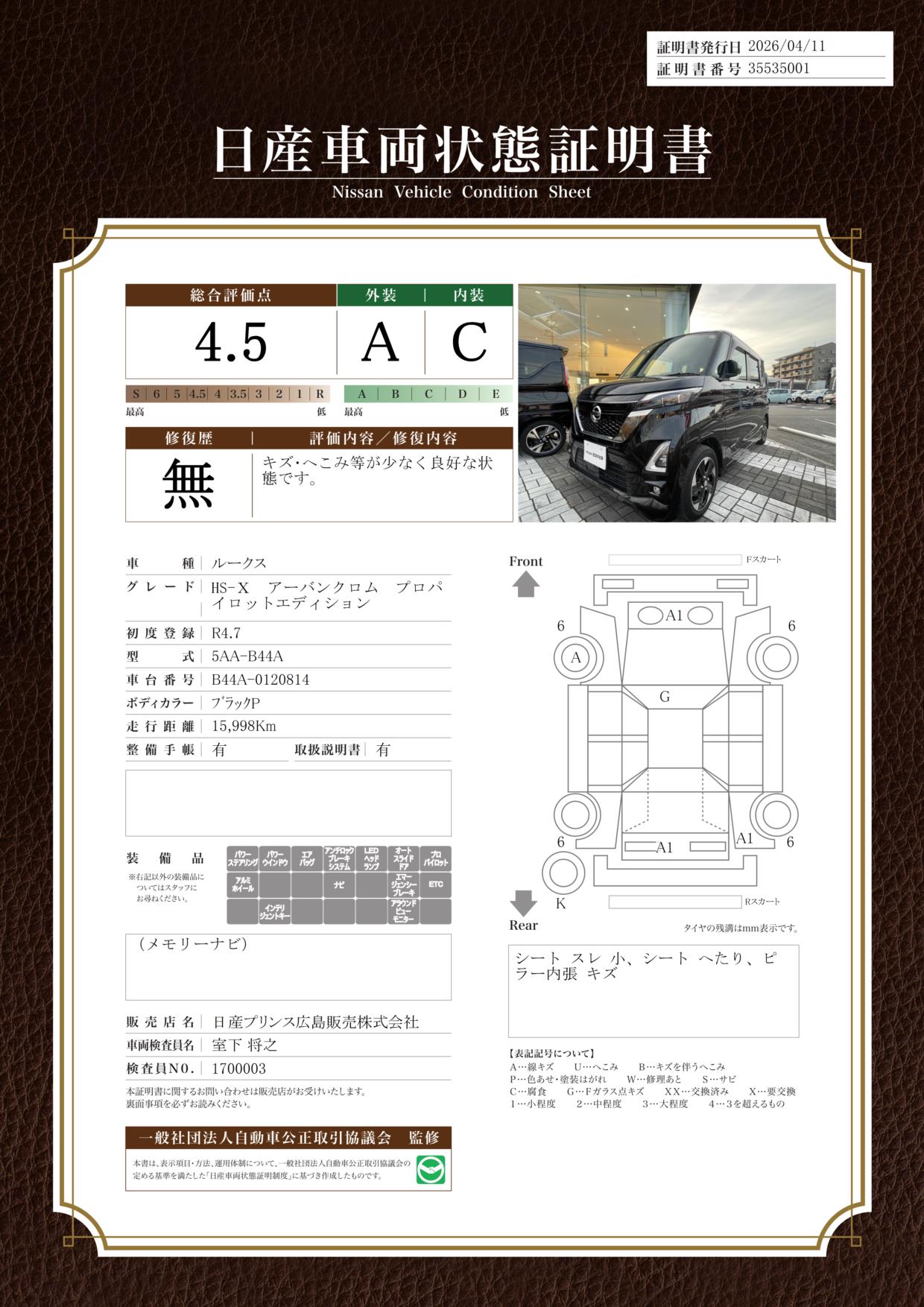 「車両状態証明書」は、査定協会監修のプロの検査員が公正かつ確かな基準で検査した”安心の証”です。