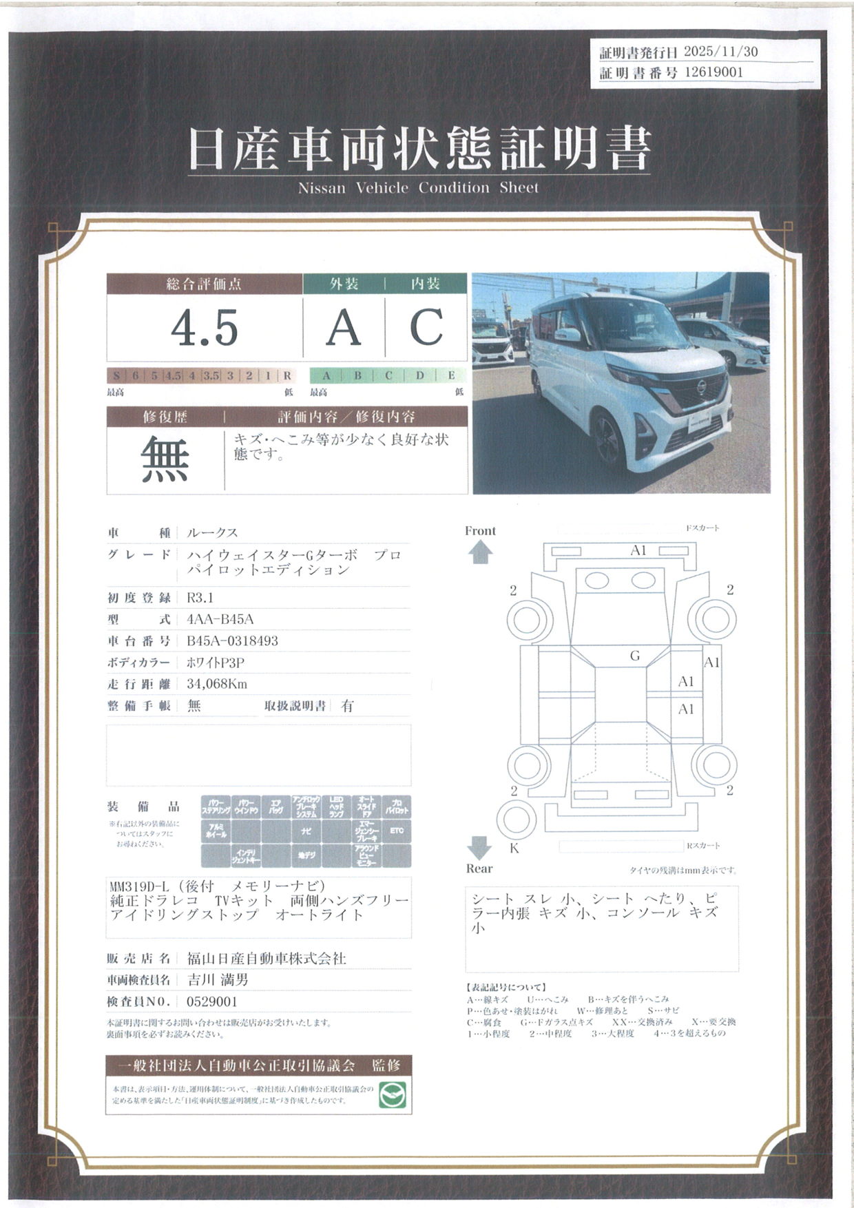 評価点イメージ : キズ・へこみ等が少なく良好な状態です。