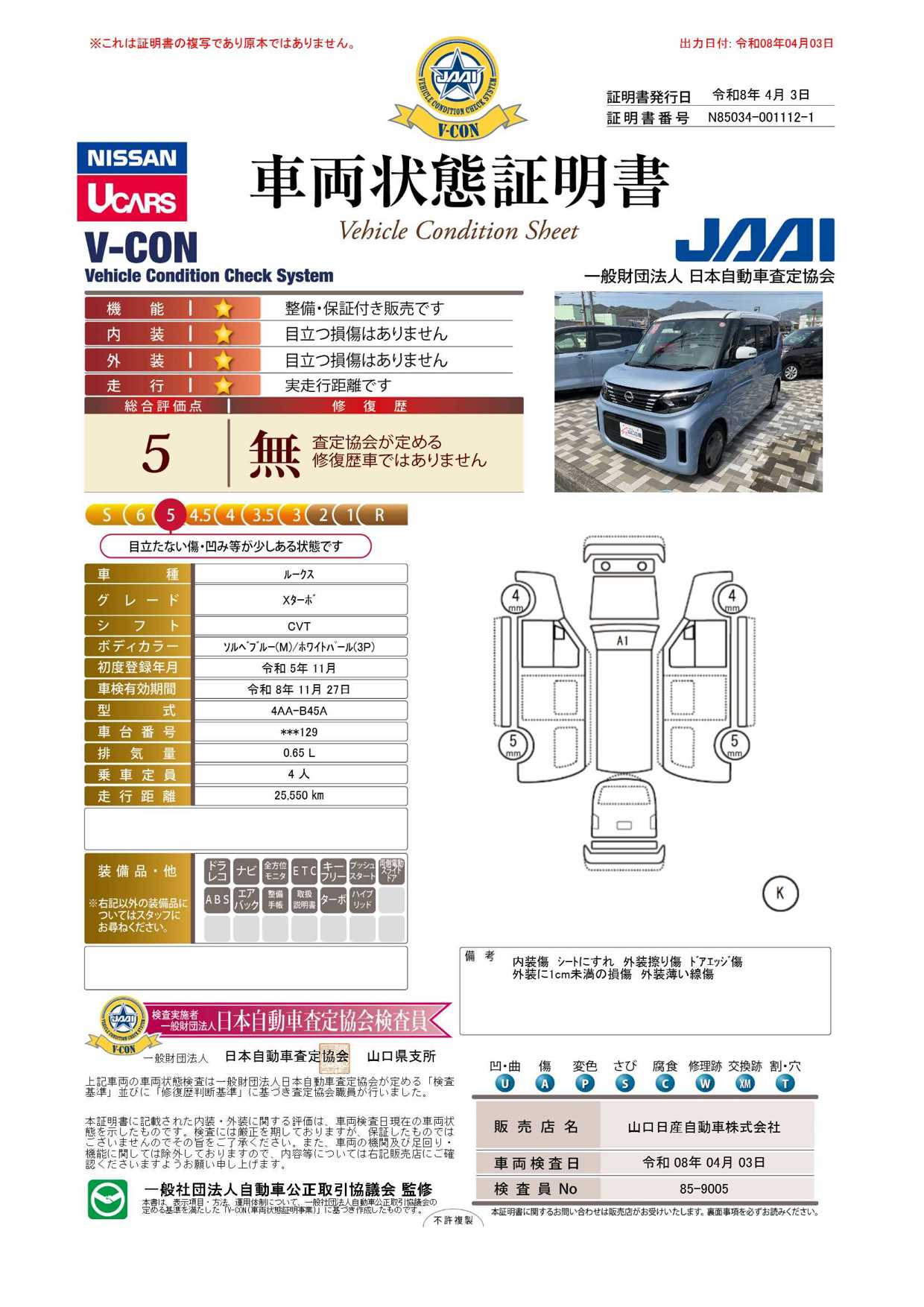 「車両状態証明書」は、査定協会監修のプロの検査員が公正かつ確かな基準で検査した”安心の証”です。