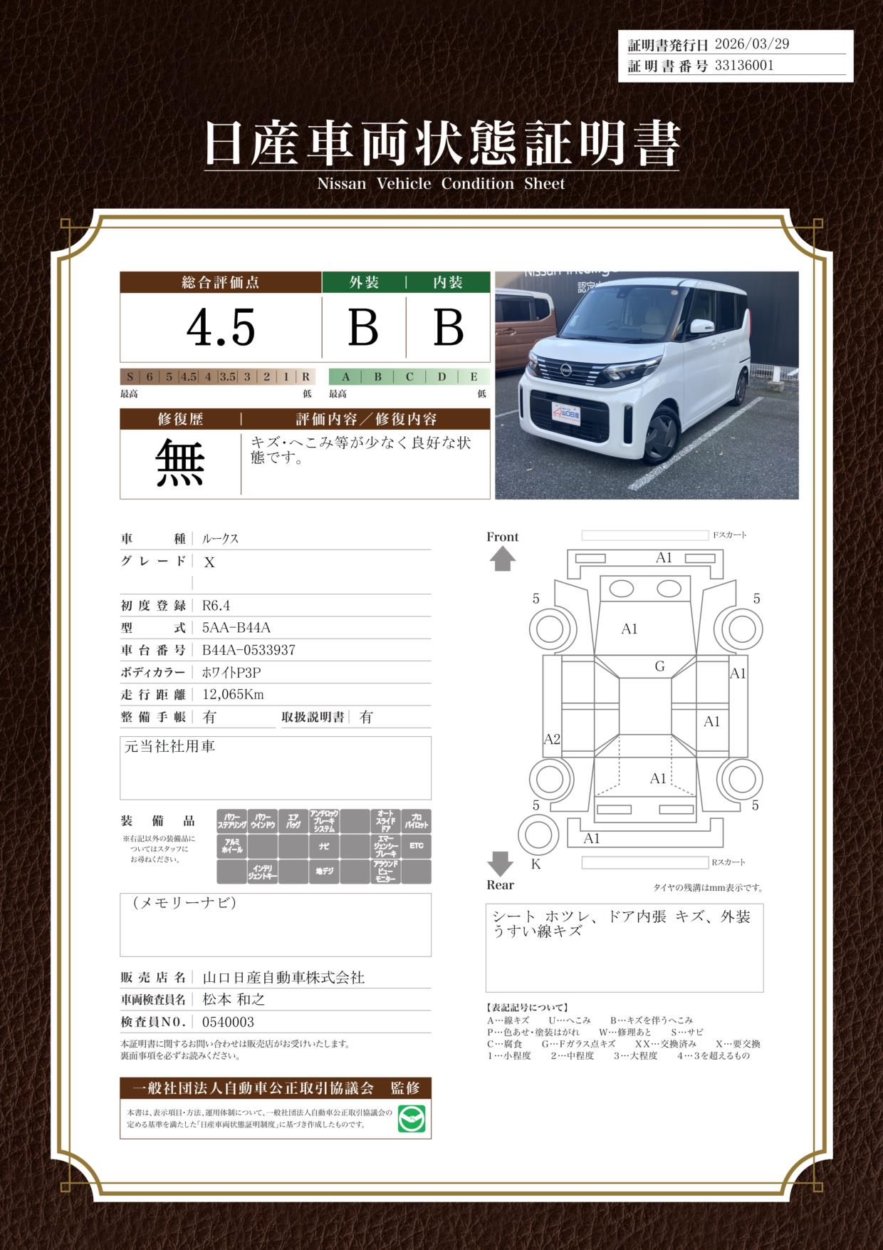 「車両状態証明書」は、査定協会監修のプロの検査員が公正かつ確かな基準で検査した”安心の証”です。