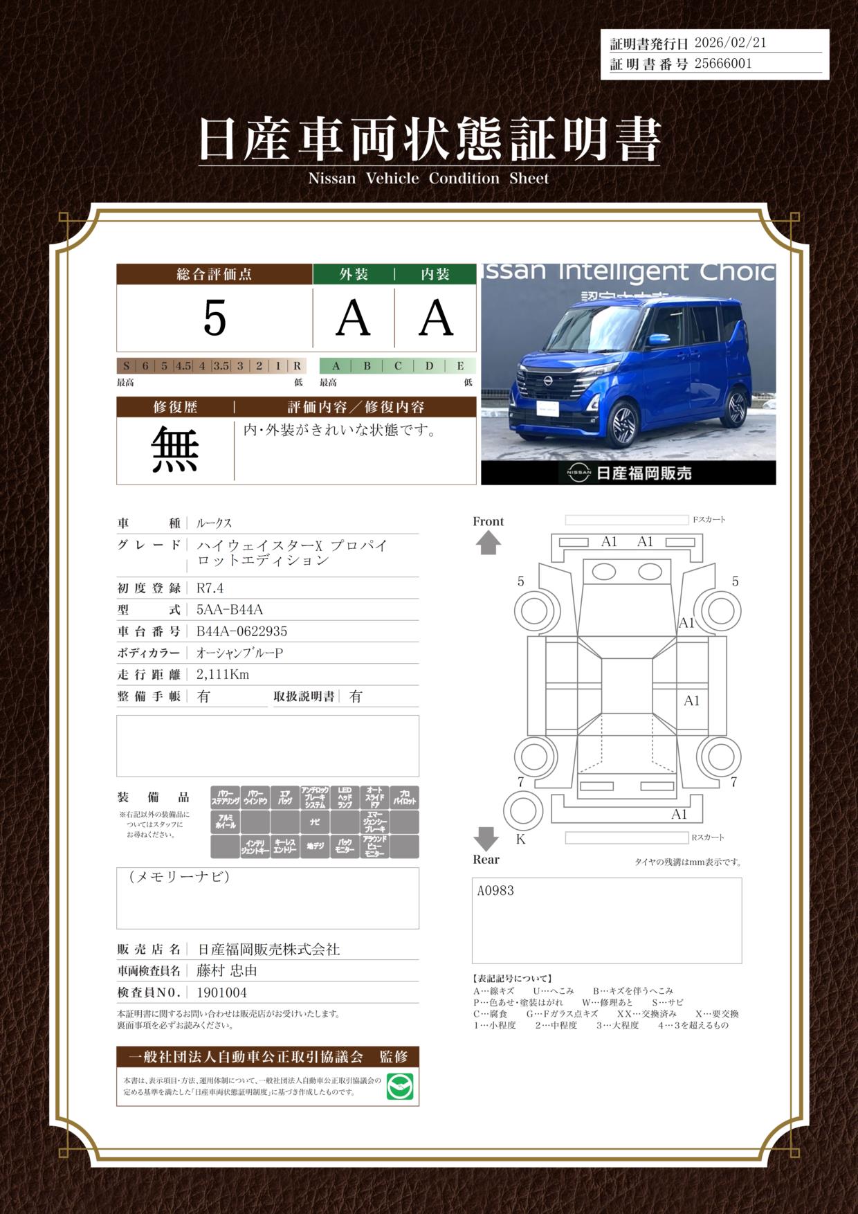 「車両状態証明書」は、査定協会監修のプロの検査員が公正かつ確かな基準で検査した”安心の証”です。